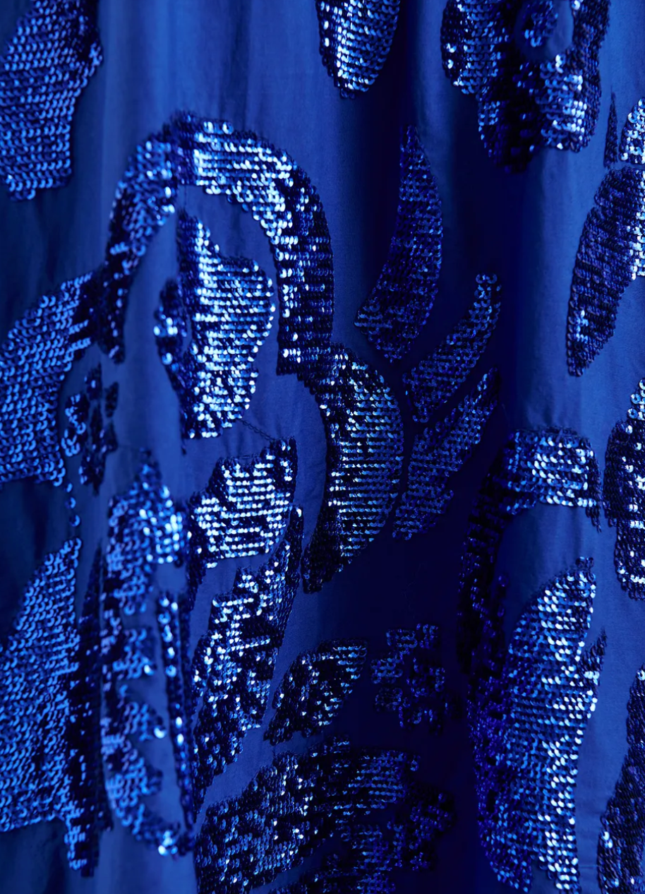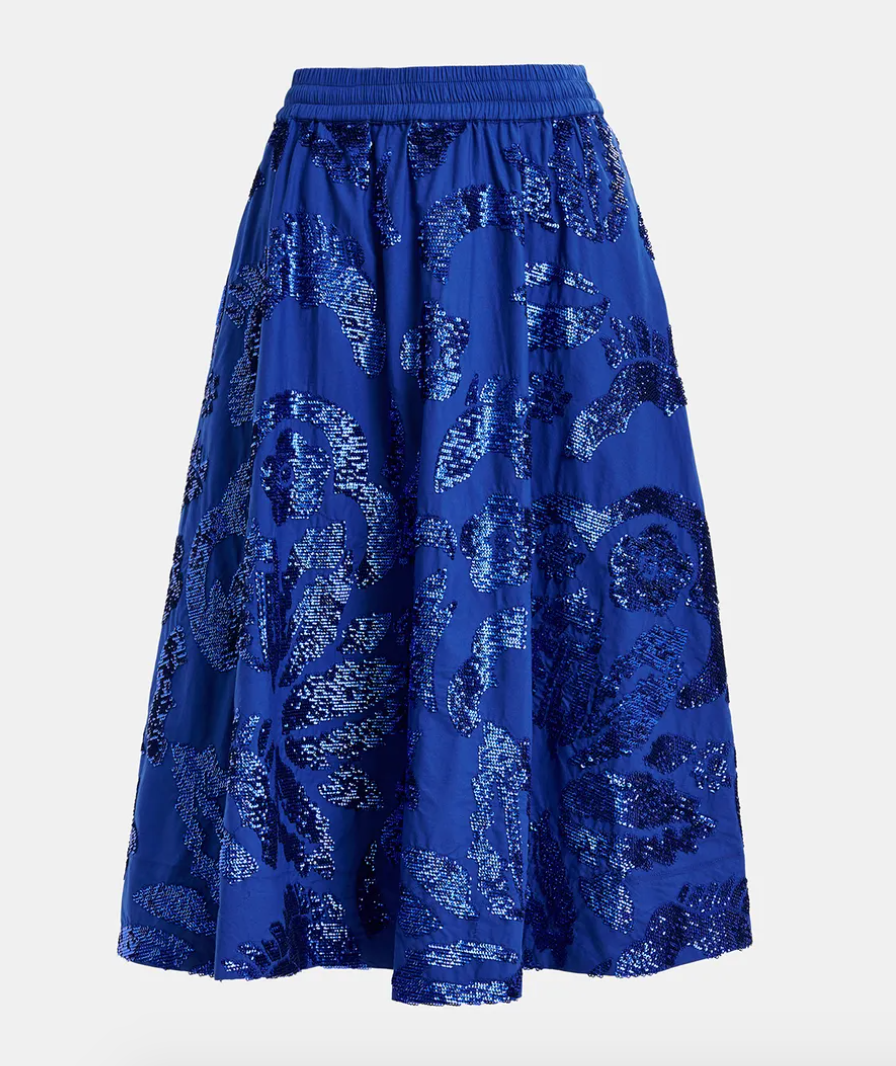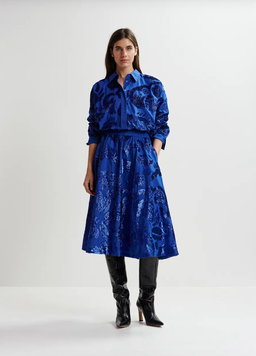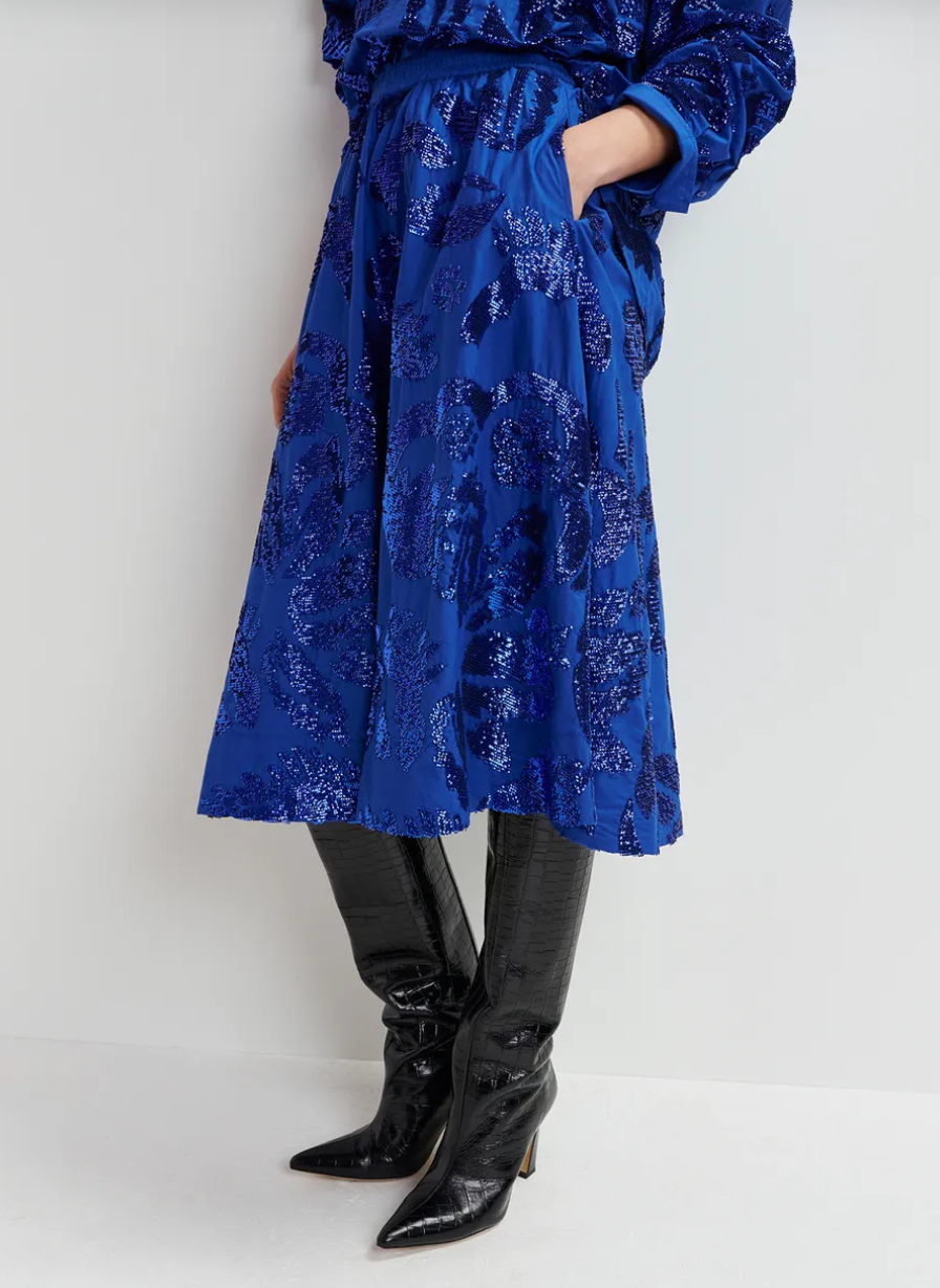 Make every step sparkle with the Essentiel Antwerp Gatsby skirt in vibrant cobalt blue! Covered in playful sequins that catch the light with every move, this skirt adds a fun, flirty twist to your outfit. Perfect for dancing the night away or turning heads at your next event, it brings energy and shine to your wardrobe with a lively, unforgettable flair.