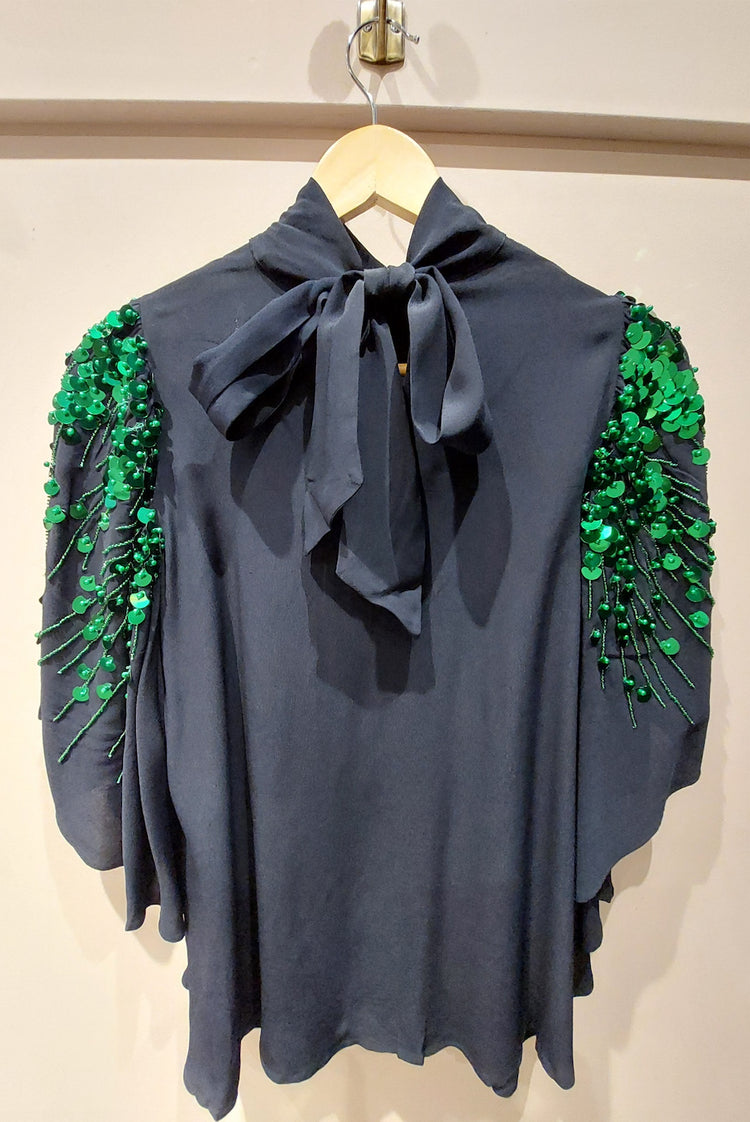 Elevate your wardrobe with this navy blouse, a refined piece that seamlessly blends elegance with contemporary flair. Delicate green sequins cascade across the shoulders and neckline, creating a subtle shimmer that catches the light beautifully. The charming bow tie detail at the back of the neck adds a touch of playful sophistication, making this blouse perfect for both professional settings and evening occasions. A versatile staple that transforms any outfit into something truly special.