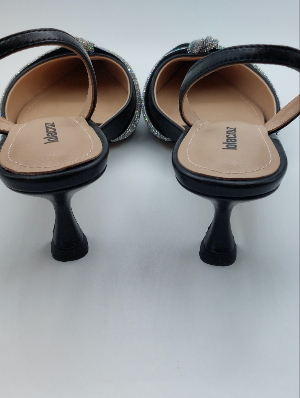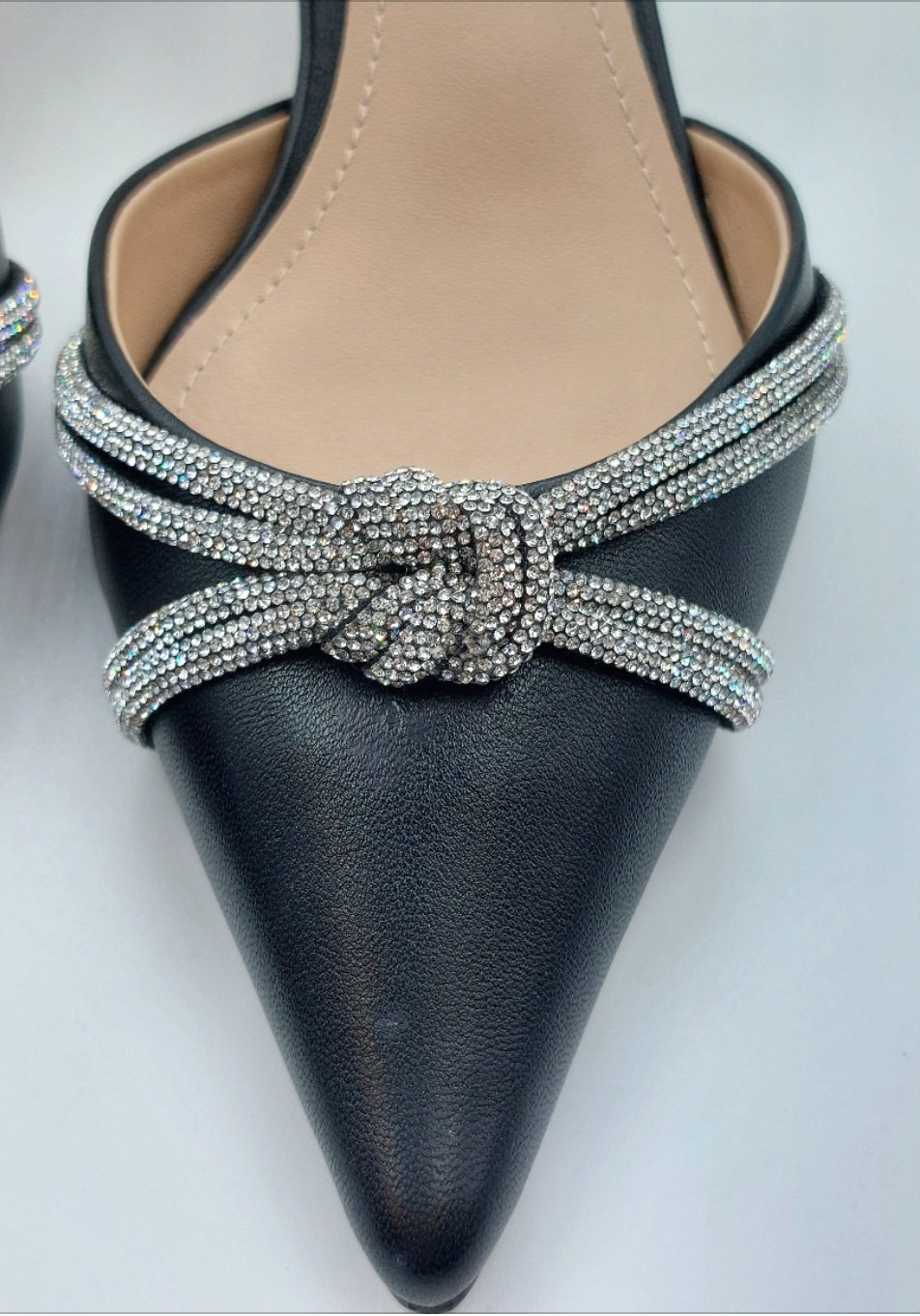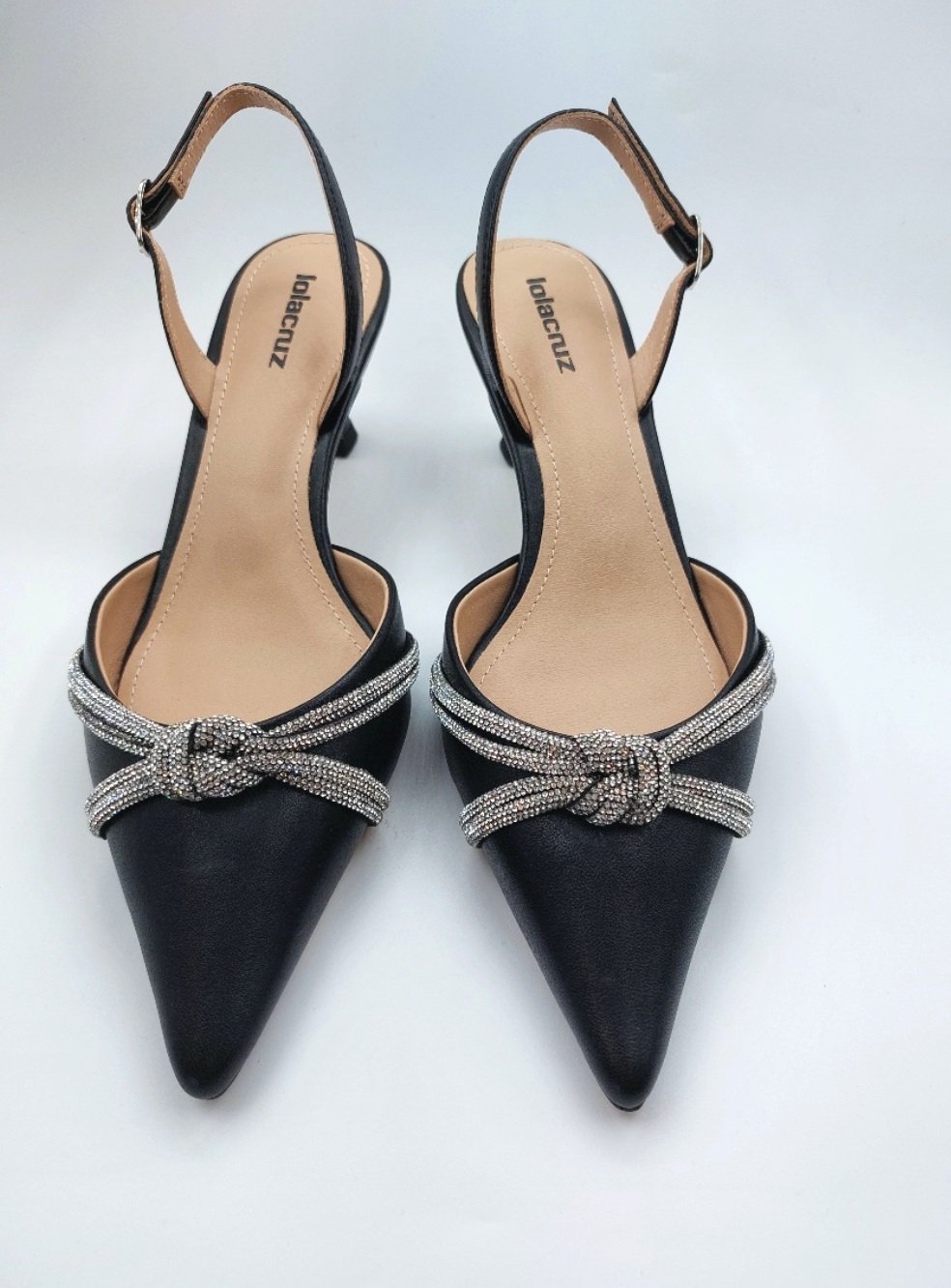 55mm kitten heel sling back shoe with beautiful diamanté knot twist .