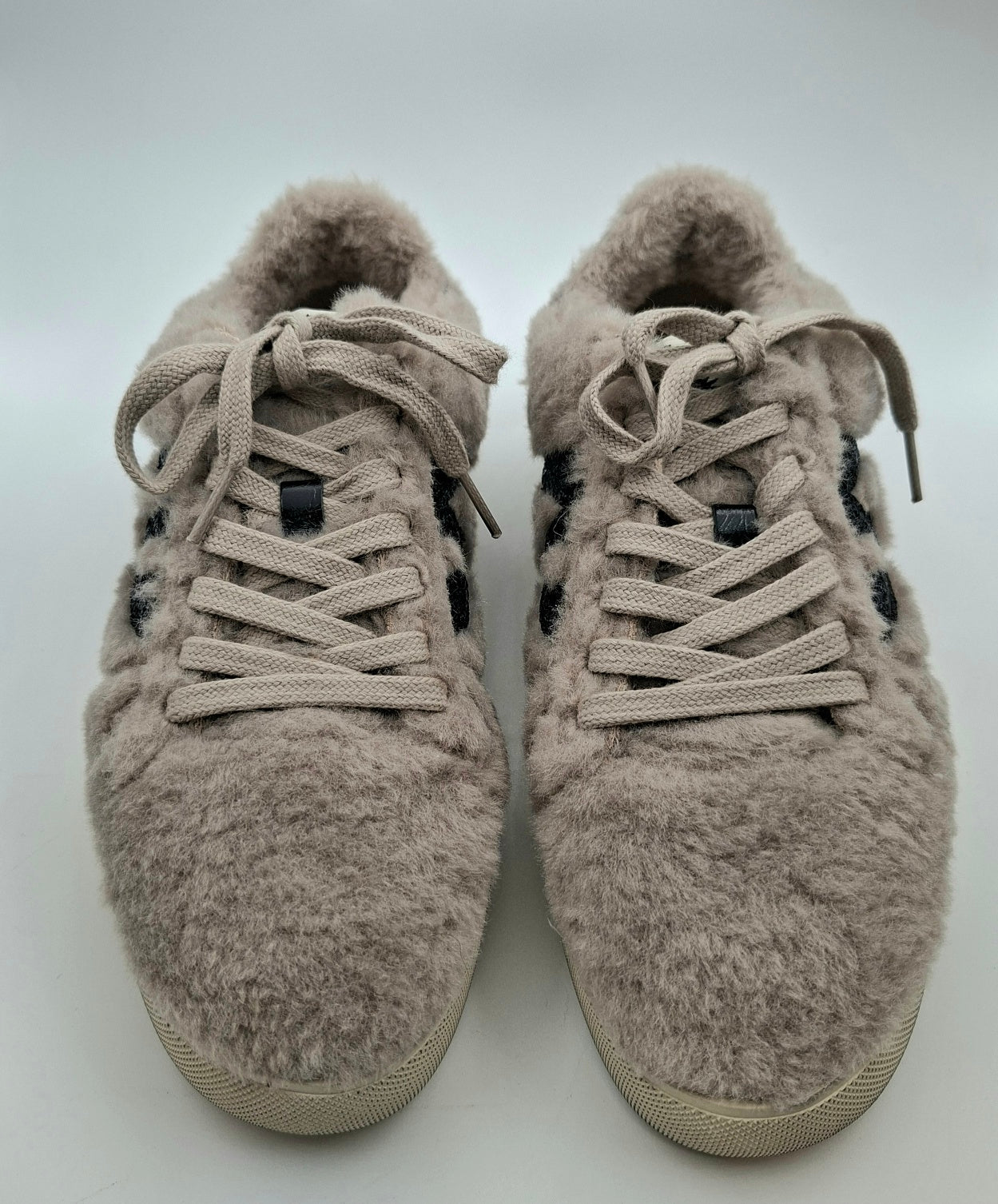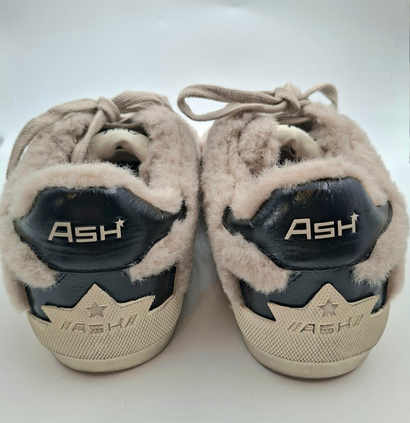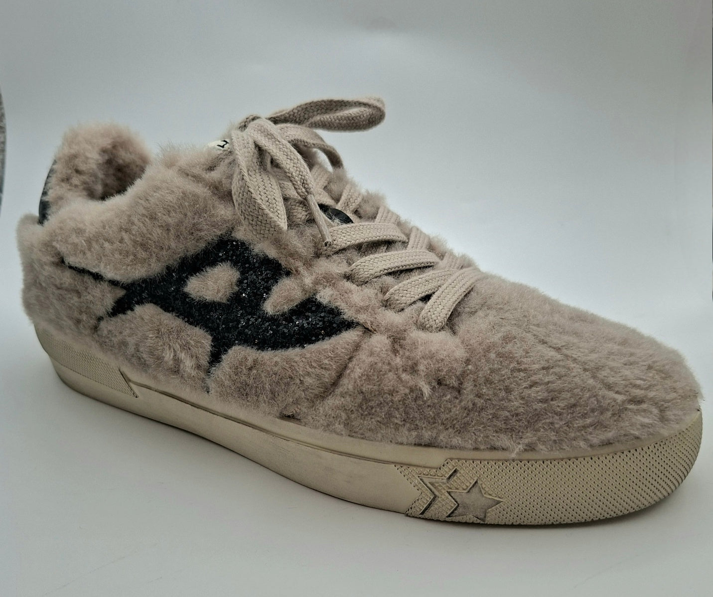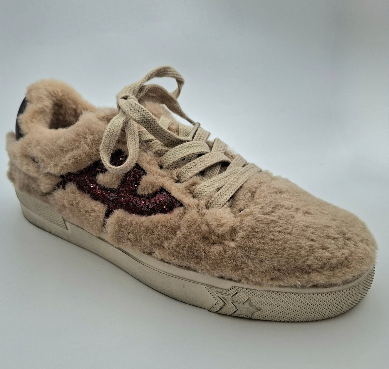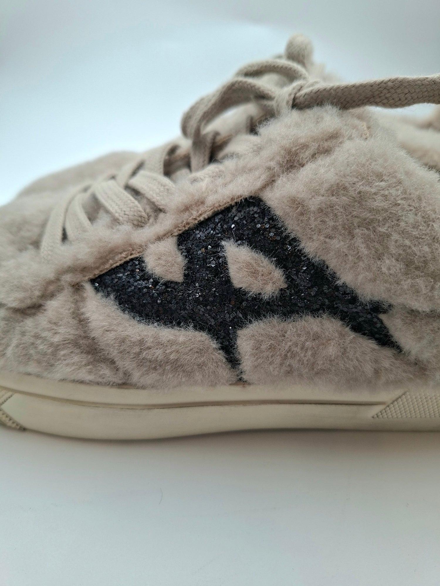 Ash Malibu Faux Shearling Sneakers, which are a stylish and cozy option for cooler weather. These sneakers feature a faux shearling upper, adding a touch of warmth and texture to the classic low-top design. They are adorned with glitter details, providing a chic contrast to the plush material. The lace-up style ensures a secure fit, while the rubber sole offers comfort and durability.