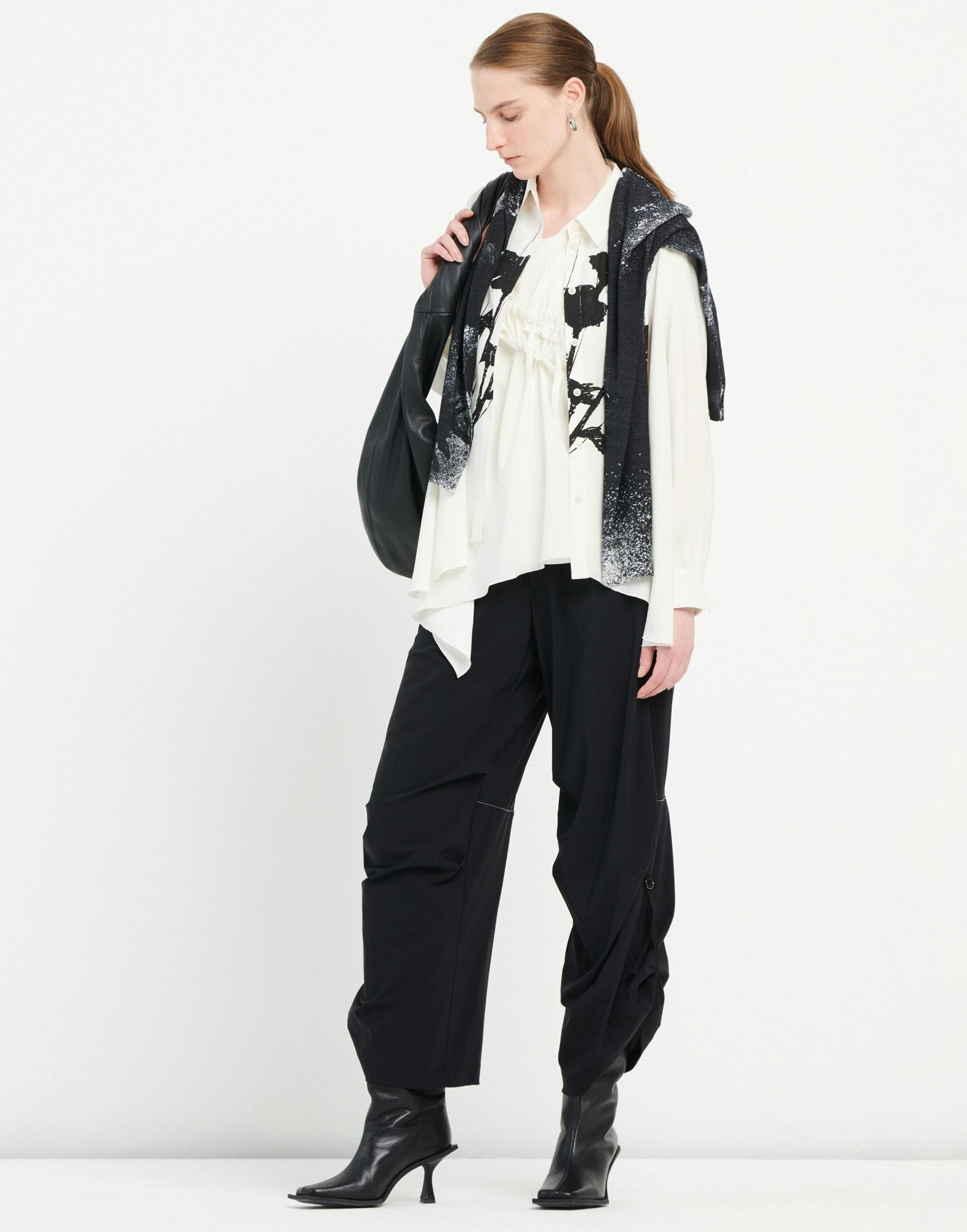 The Outgoing pants capture the essence of '90s style, drawing inspiration from the iconic flair of hip-hop culture. A hybrid between cargo and jogger styles, they feature an oversized fit and streetwear details such as oversized pockets, drawstrings at the hem to create unique draping, and zippers along the sides. Waistband with belt loops, elasticized at the back. Front closure with button, fly, and metal zipper. Vertical side pockets with metal zippers. Double-stitched external side seam with straps and D-rings to adjust the length. Oversized patch pockets with flaps and buttons on the knees, inner knee darts. Exposed seams at the back. • Technical micro piqué, medium weight, crêpe handfeel.