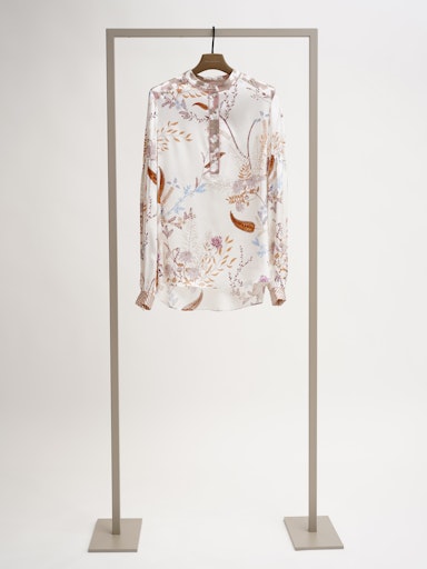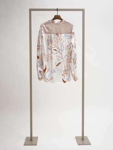 95% silk / 5% elastane, stretch silk. Nice cut, likely a regular fit. Balloon detail on sleeve .