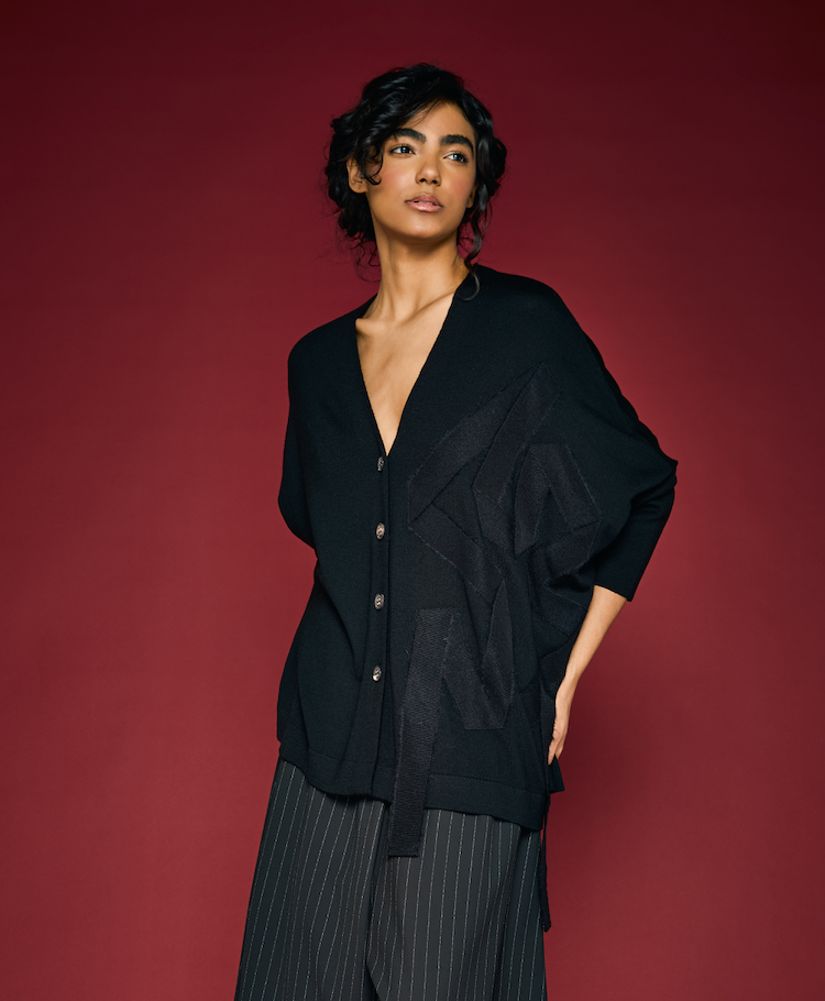 V-neck, front buttons, striped grosgrain trim relaxed fit