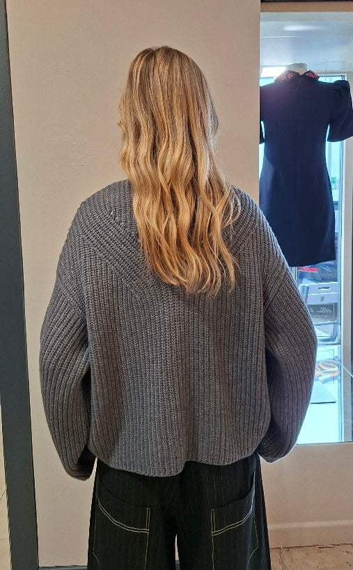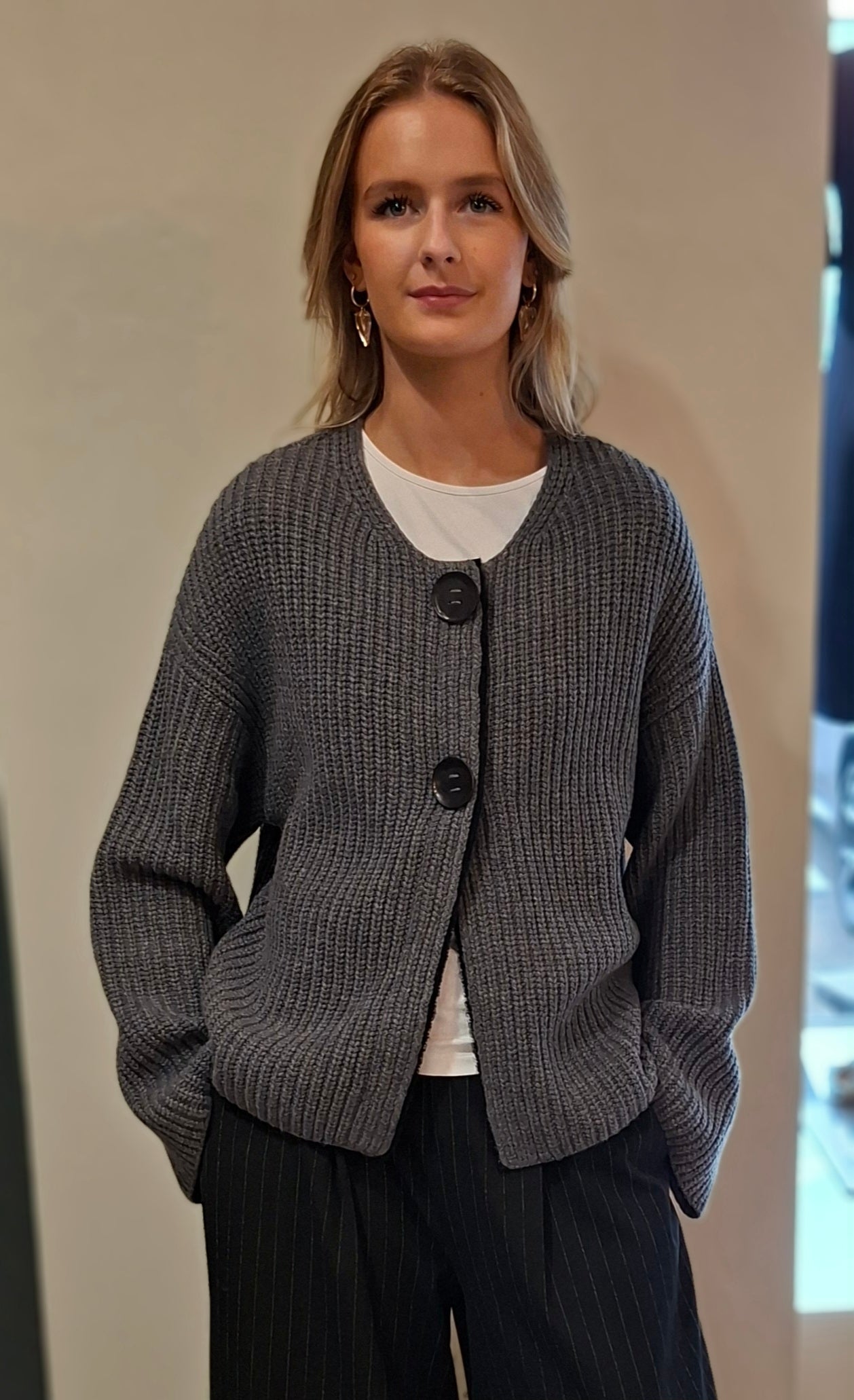 Stay cozy and stylish in this knit cardigan featuring sleek leather buttons, a comfy round neck, and a relaxed loose fit. Perfect for layering on chilly days while adding a fun, touchable twist to your outfit!