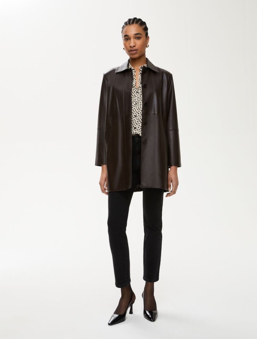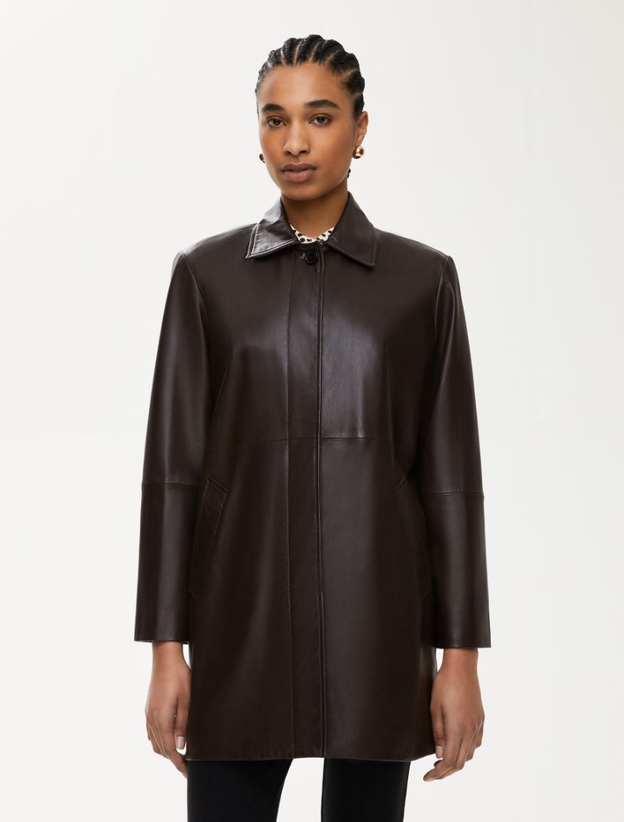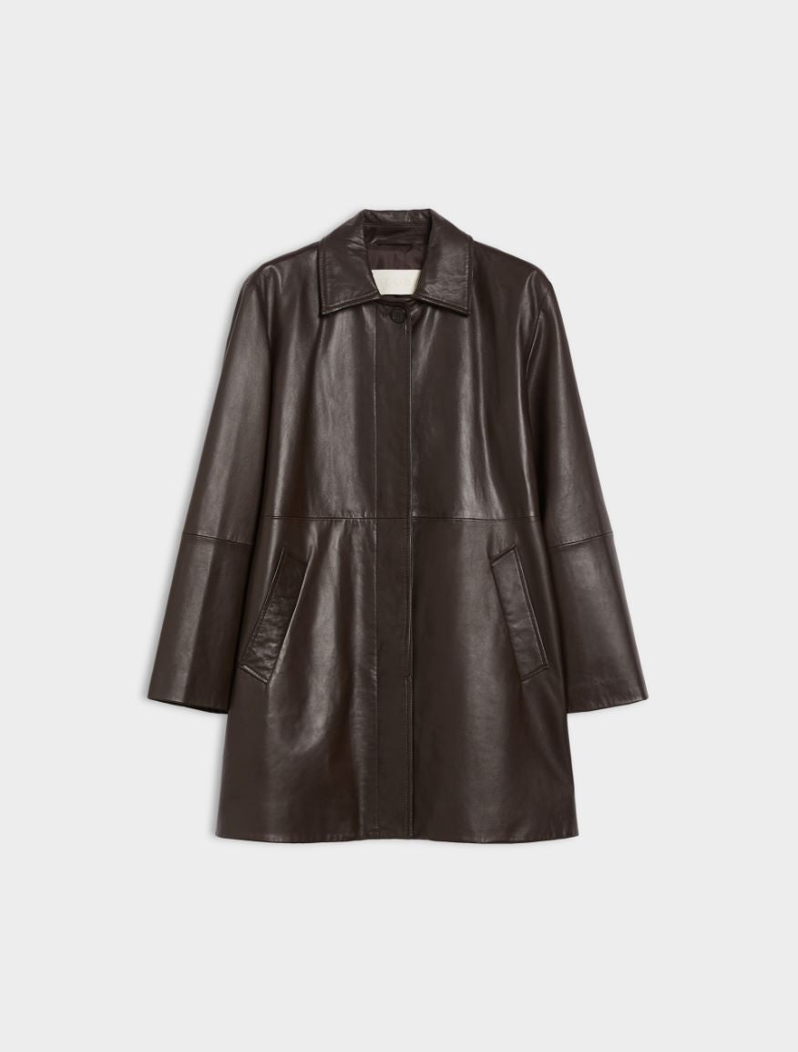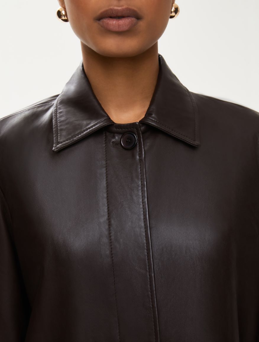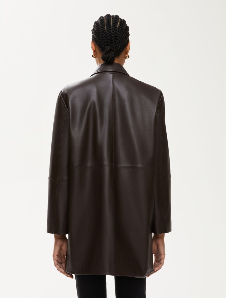 A refined leather jacket with a clean, straight silhouette and minimal details that balance classic tailoring with modern elegance.