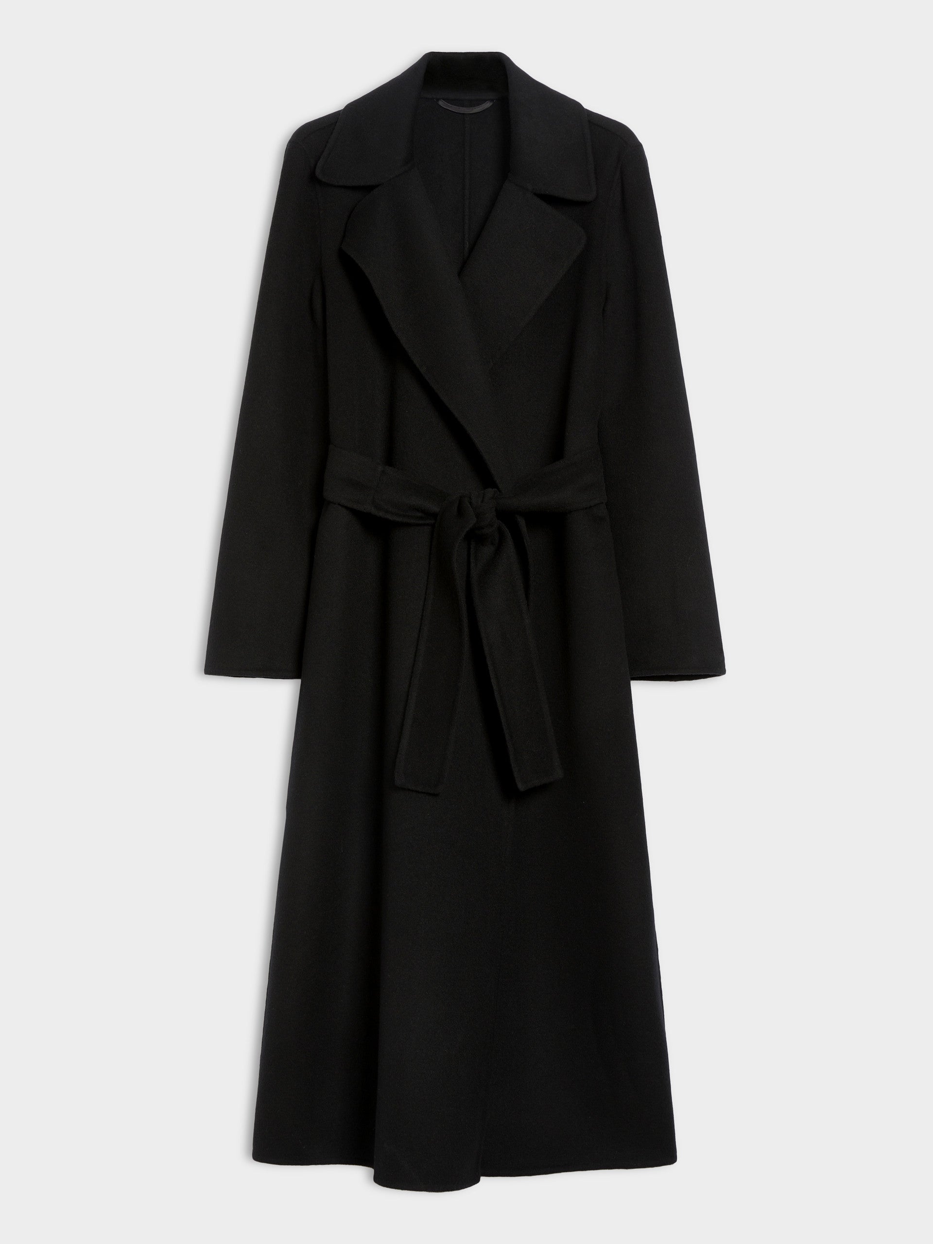 This is a double-breasted long coat crafted in a relaxed robe-like silhouette. It features a classic lapel collar, long sleeves, in-seam pockets, and discrete side slits for elegant movement.