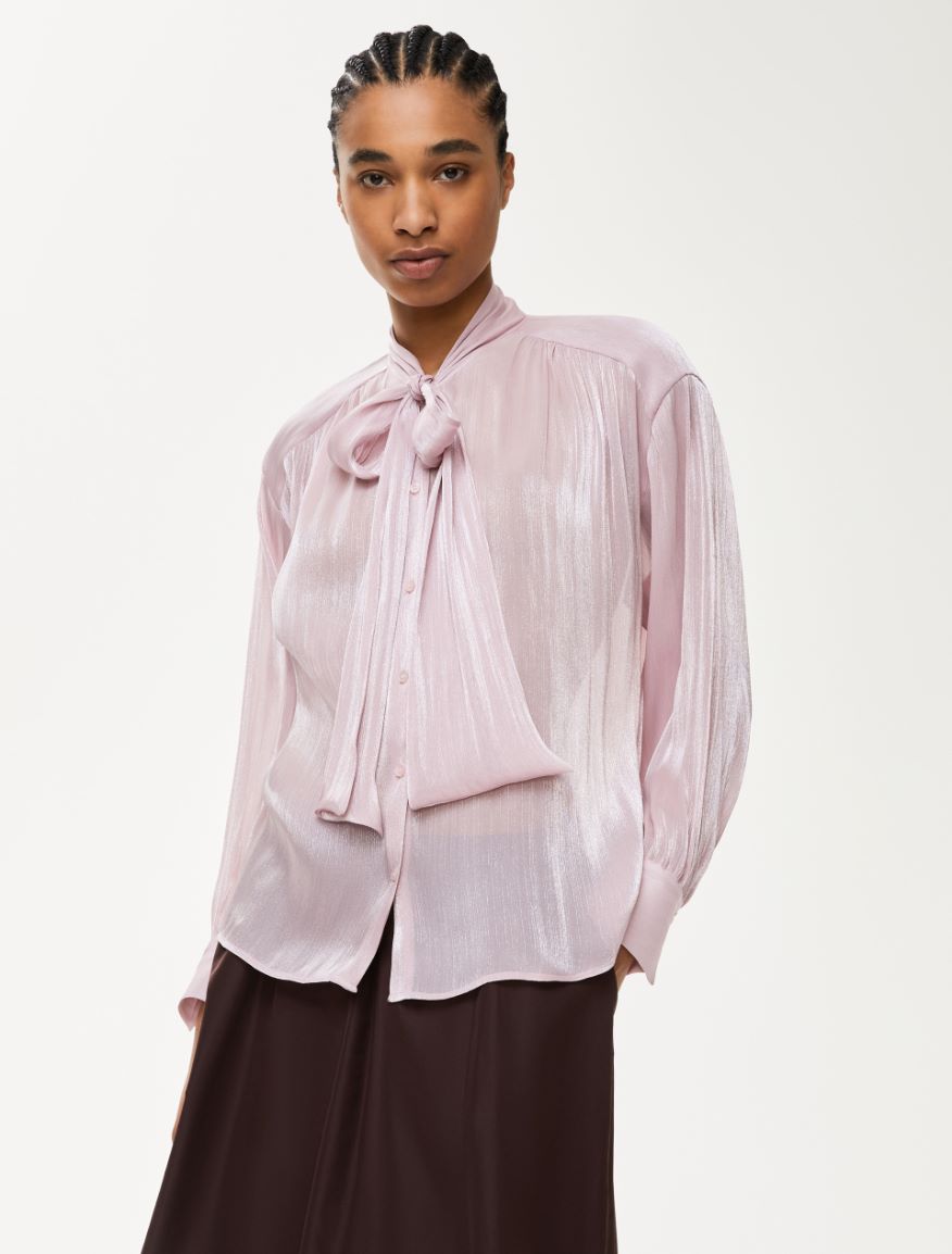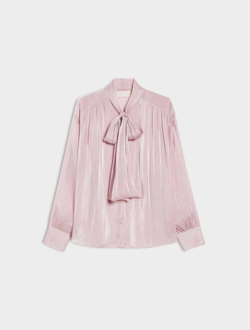 iBlues Janzir lurex bow shirt—a delicate, relaxed-fit crepe satin blouse in soft pink, featuring a charming pussy‑bow neckline and softly gathered long sleeves at the shoulders and cuffs.