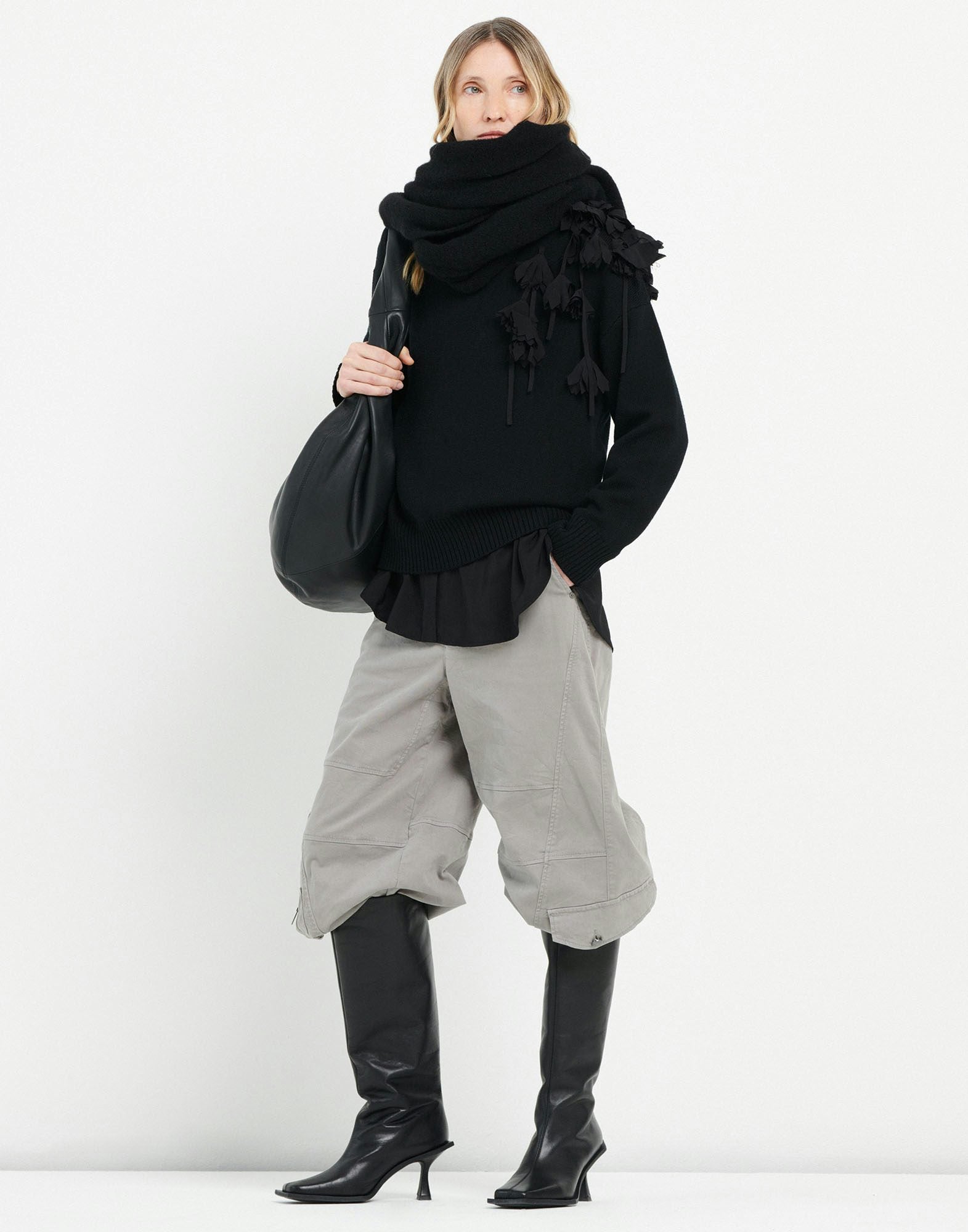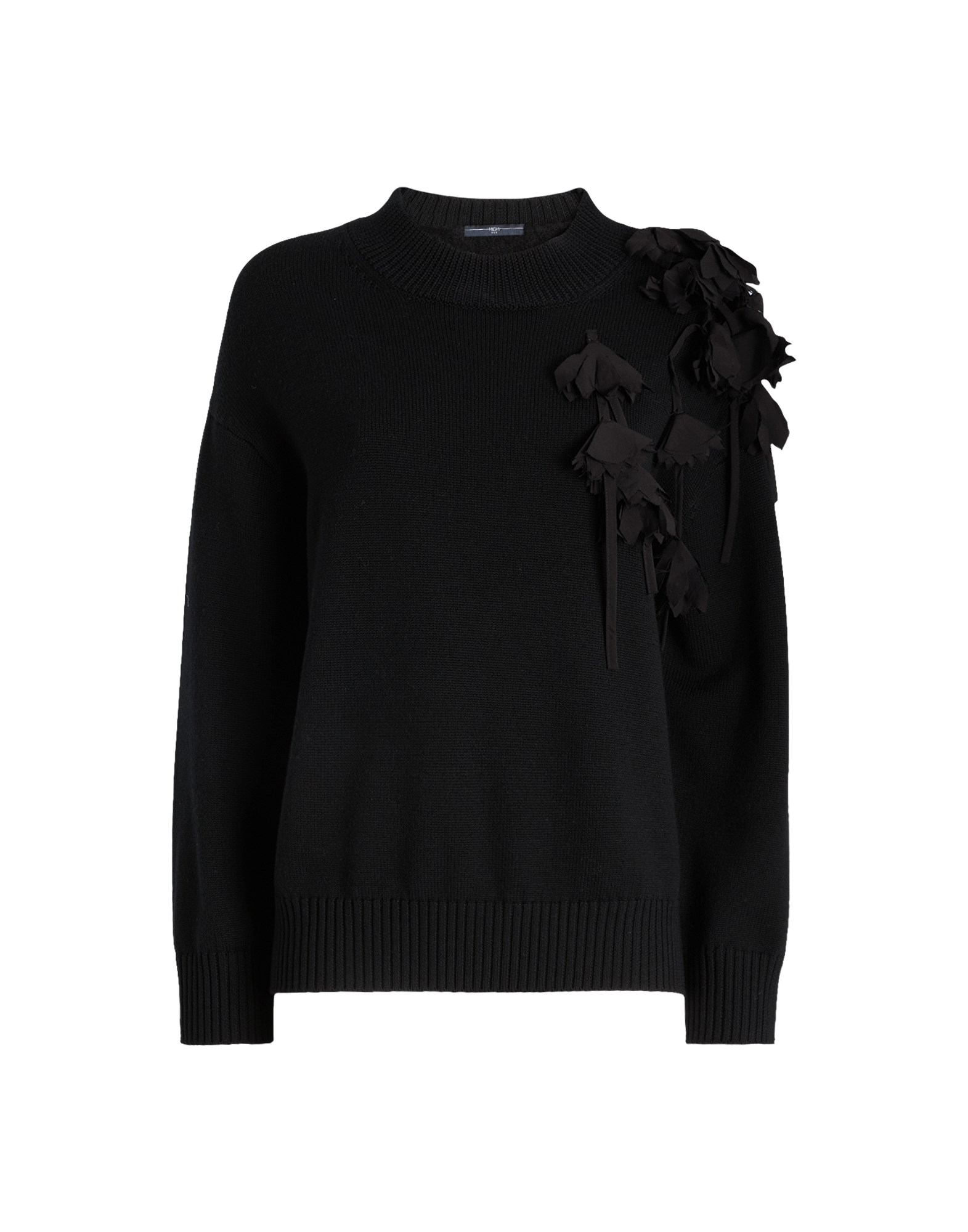 The Never-end sweater is crafted from wool and features a stand collar. A cascade of raw-edge, hand-stitched flowers tumbles from the shoulder, adding a romantic accent. Soft and comfortable, it’s a versatile piece for the colder months.