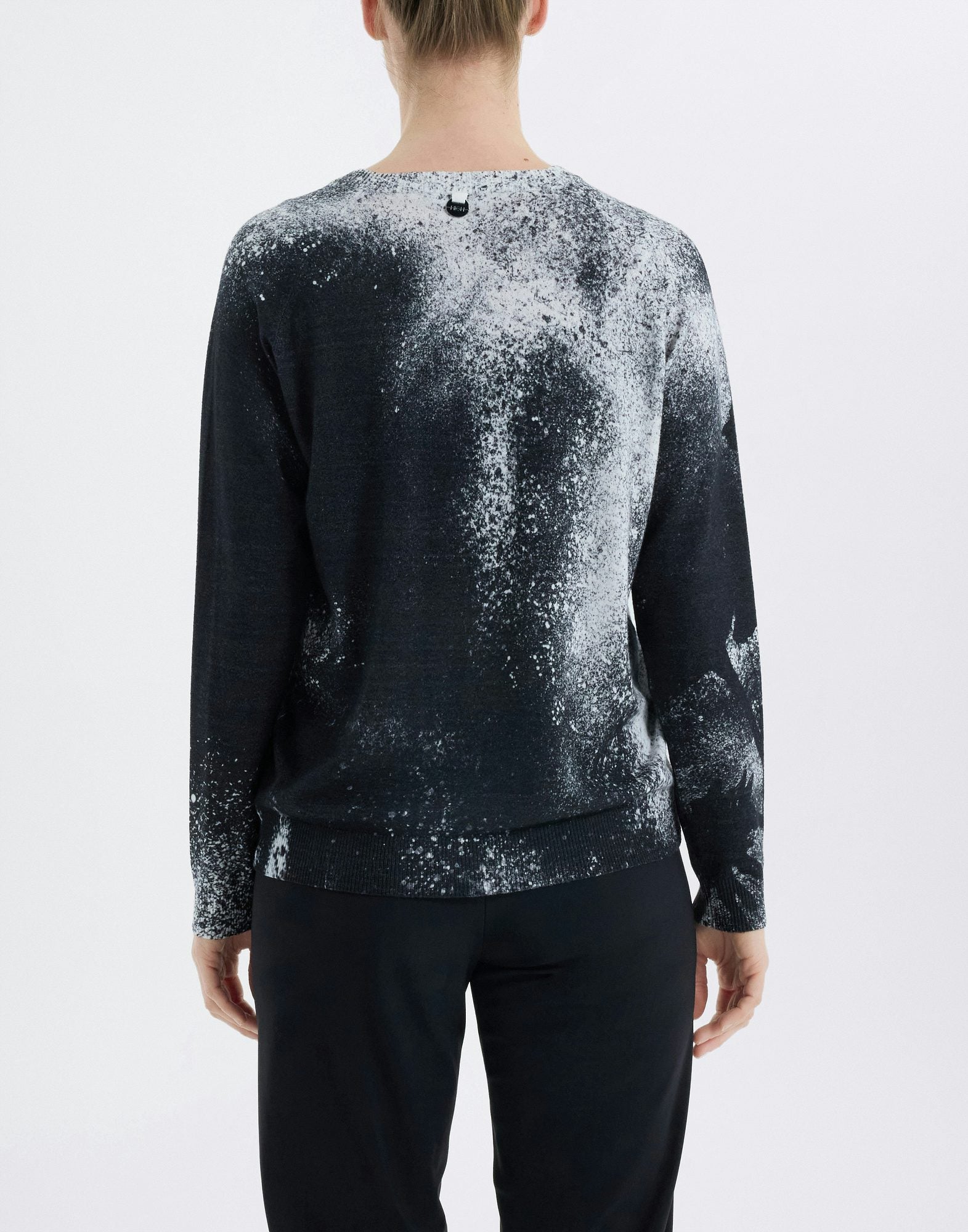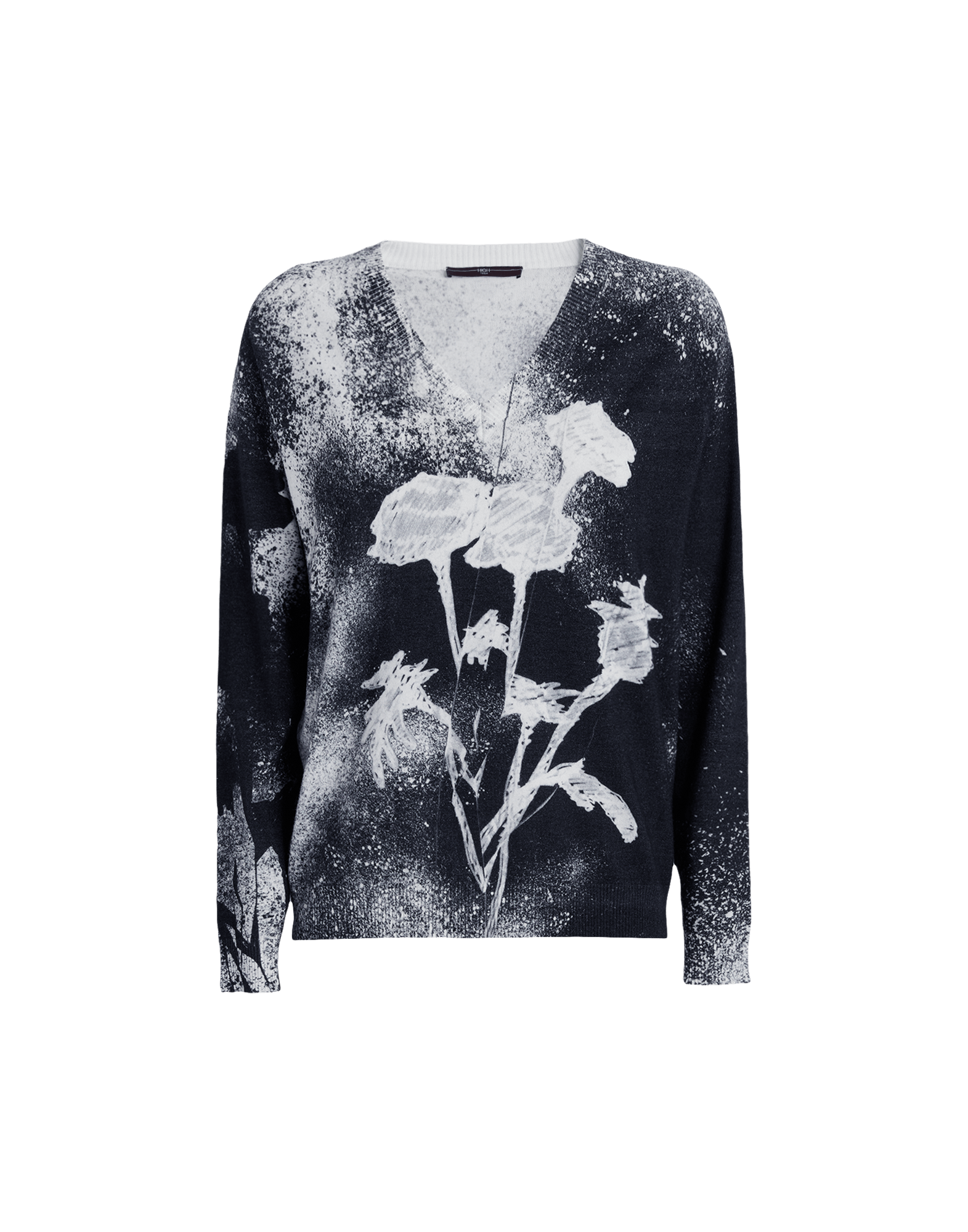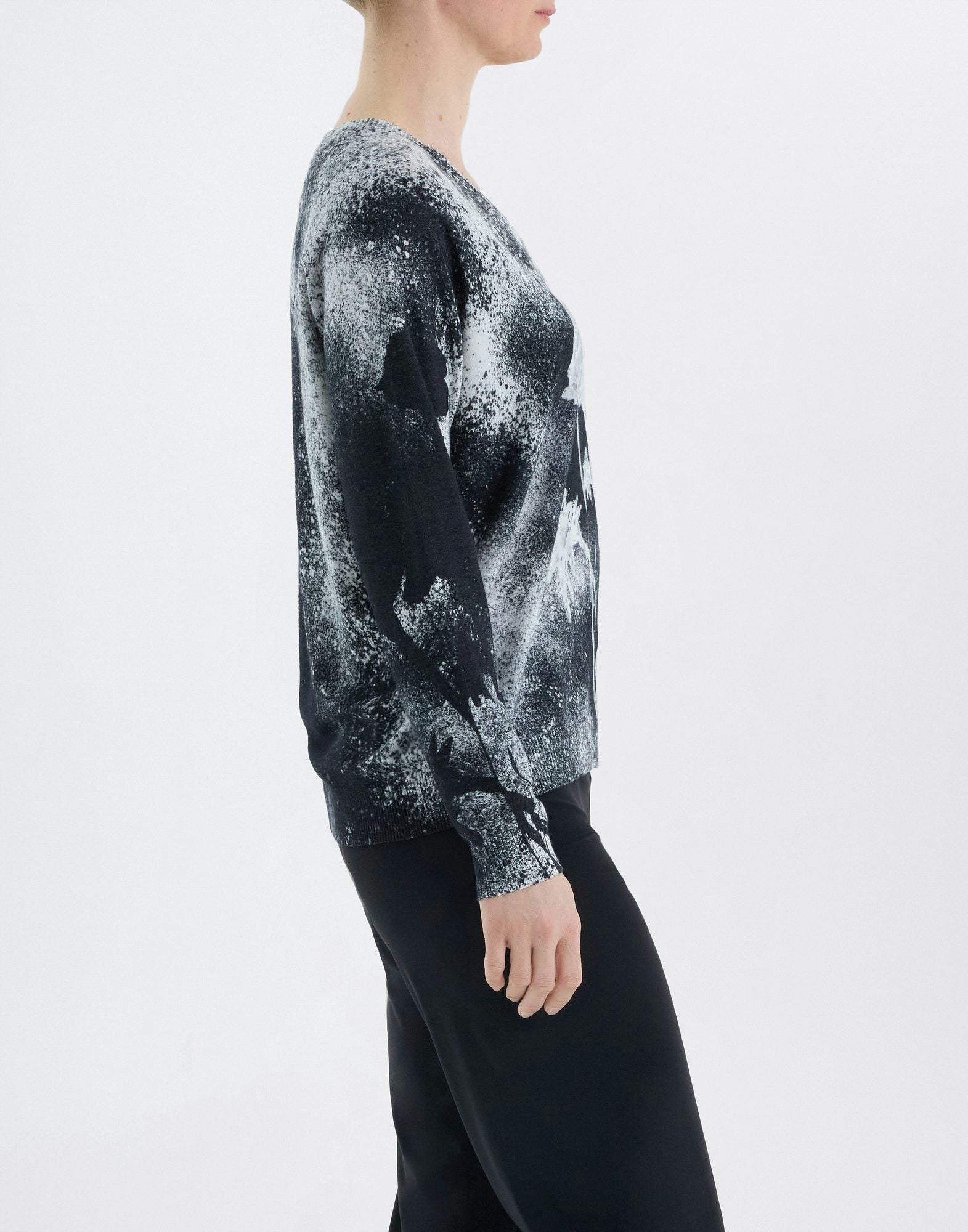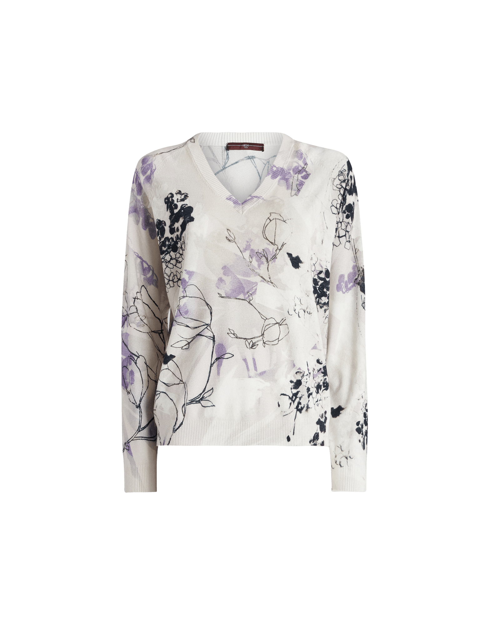 Ultra fine tech viscose knit with floral print. v neck and raglan sleeves for a comfortable fit.