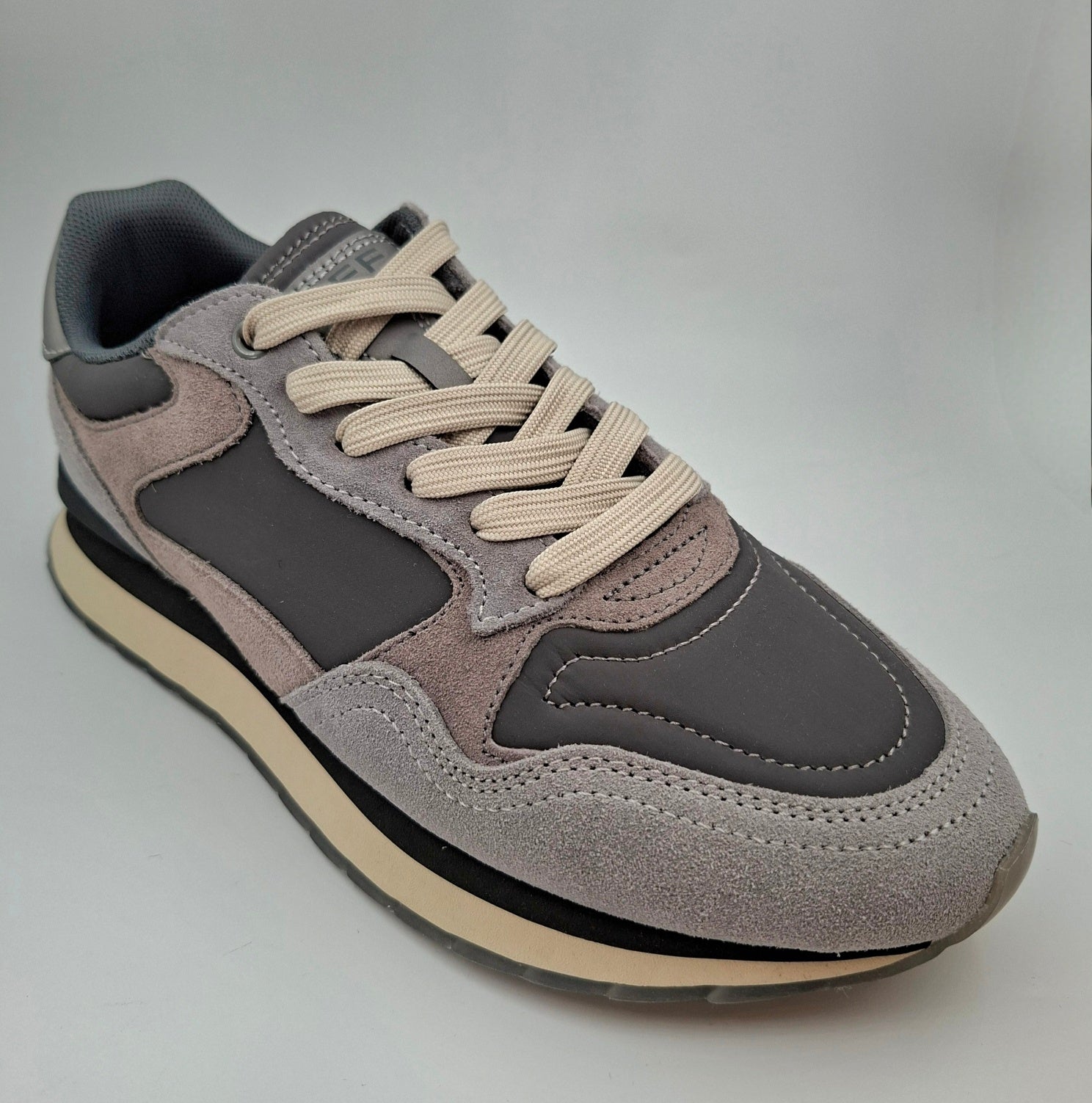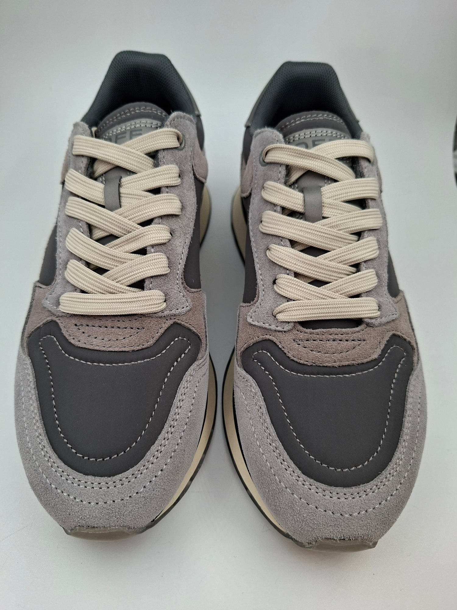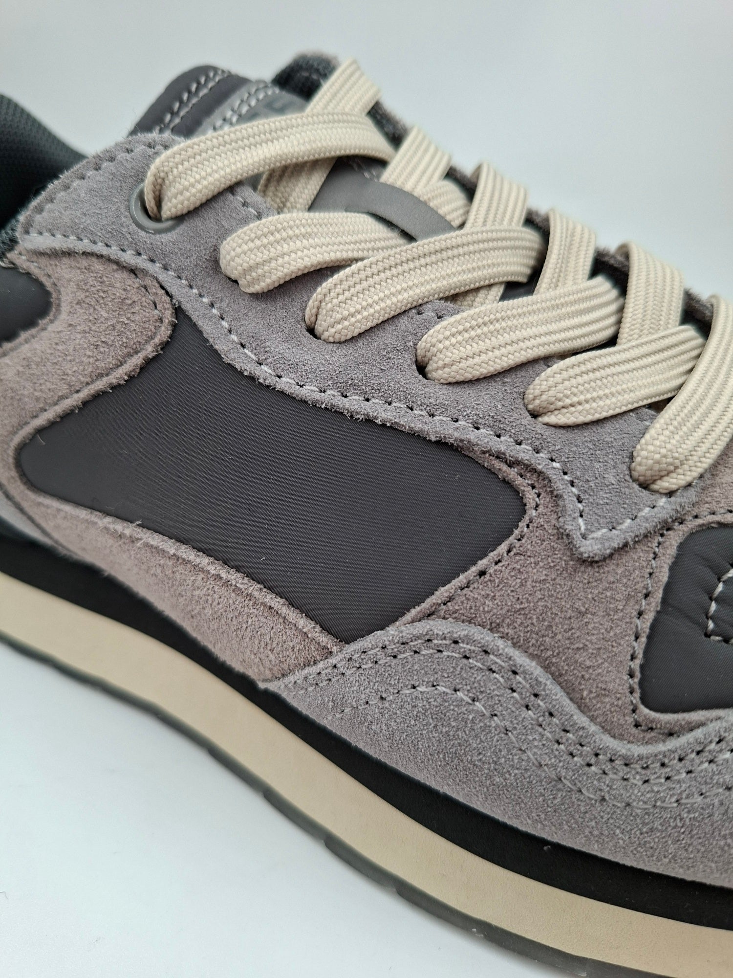 Crafted in layered shades of grey with a sleek, shiny heel counter and a screen-printed waffle sole.
