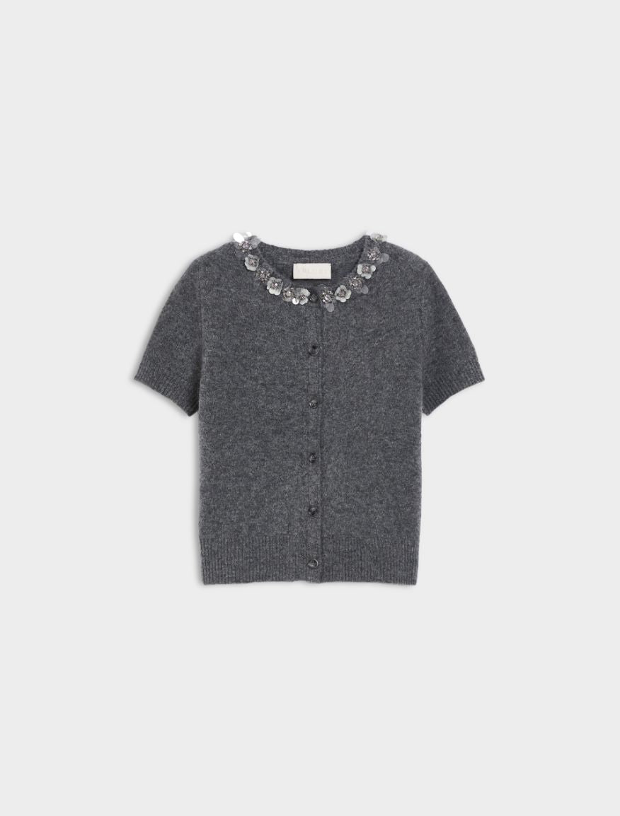 a slim fit short‑sleeve cardigan with a round neckline and fine ribbed trim. The collar is adorned with delicate sequin-floral appliqués, offering a refined, subtle sparkling effect .