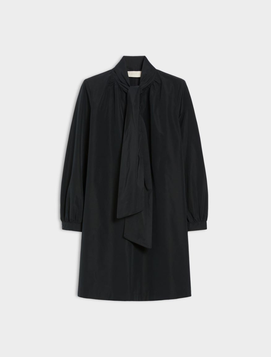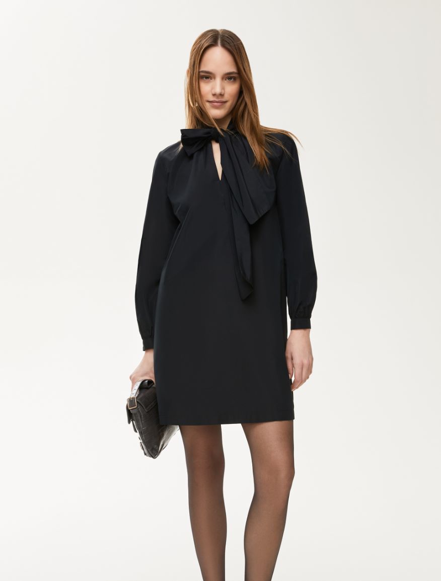 A short, playful A-line silhouette with a striking maxi bow at the neckline and gathered sleeve details.