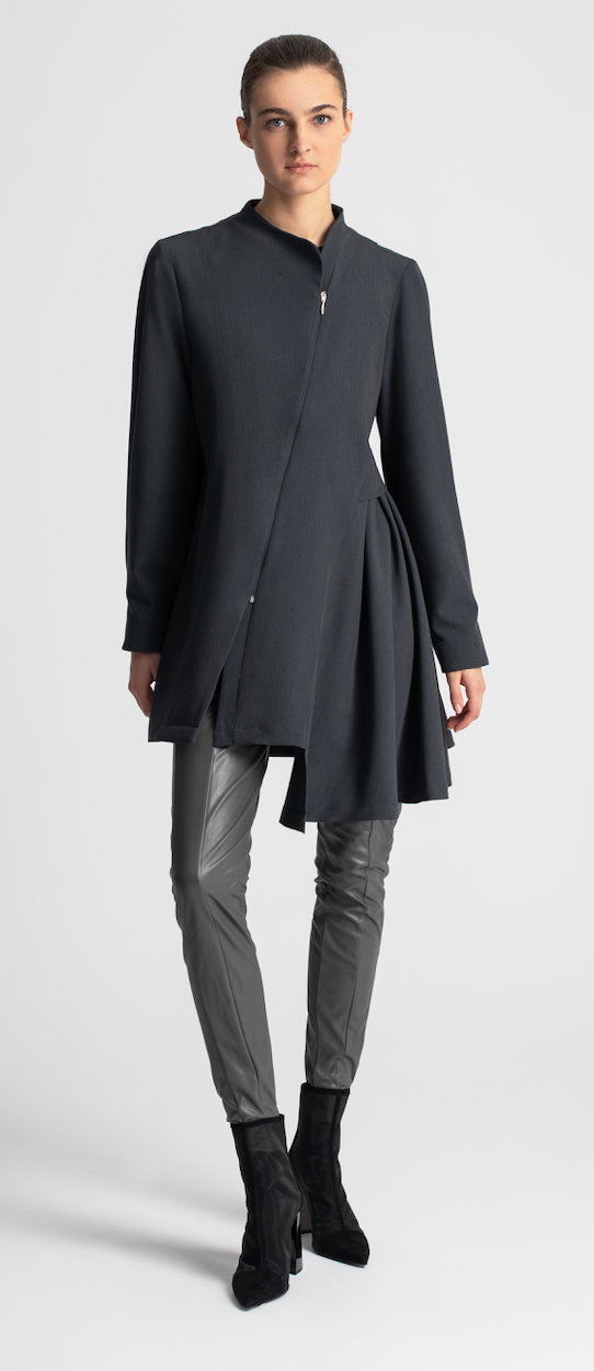 Tunic with zip and longer length detail to one side with pleats and adjustable tie.