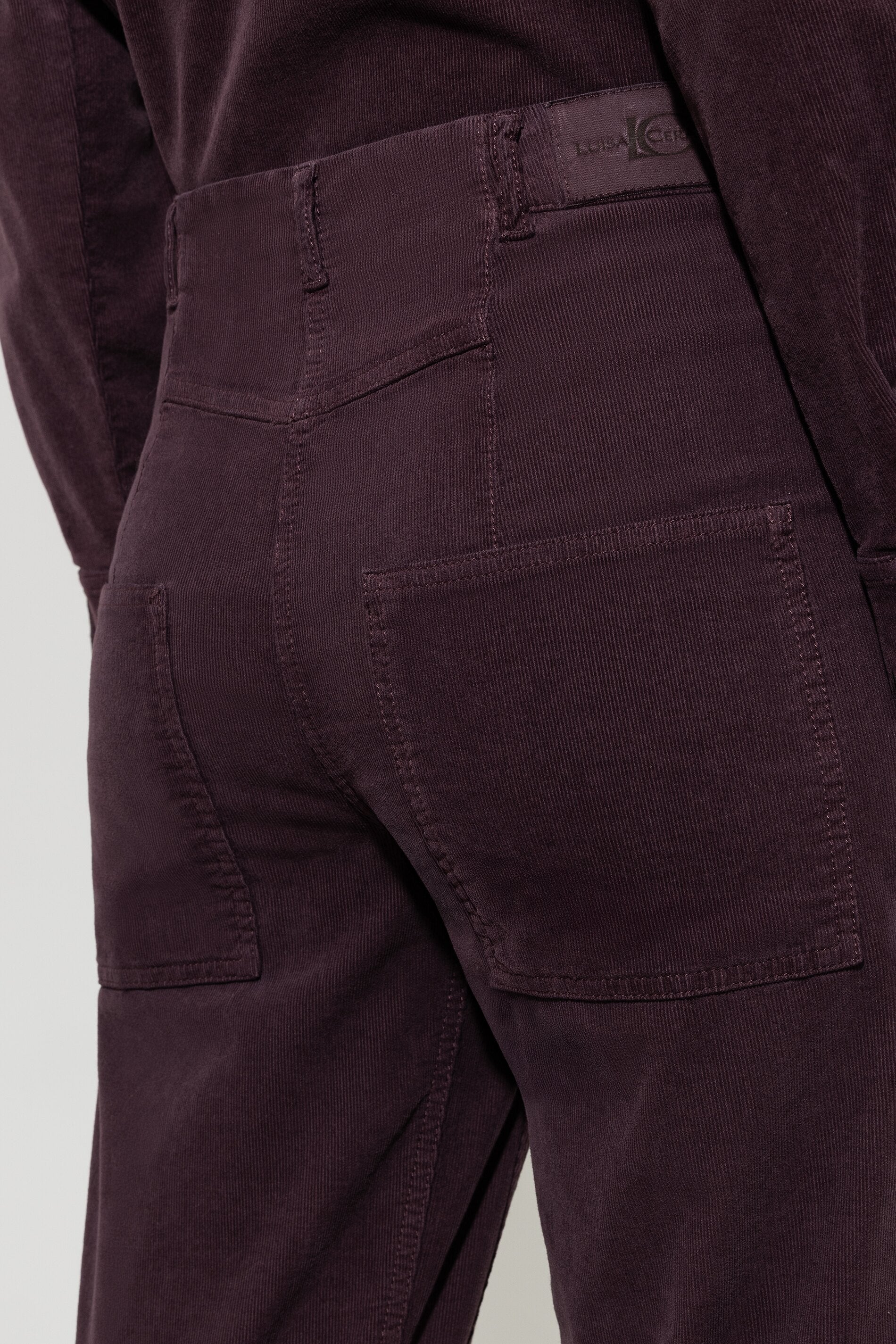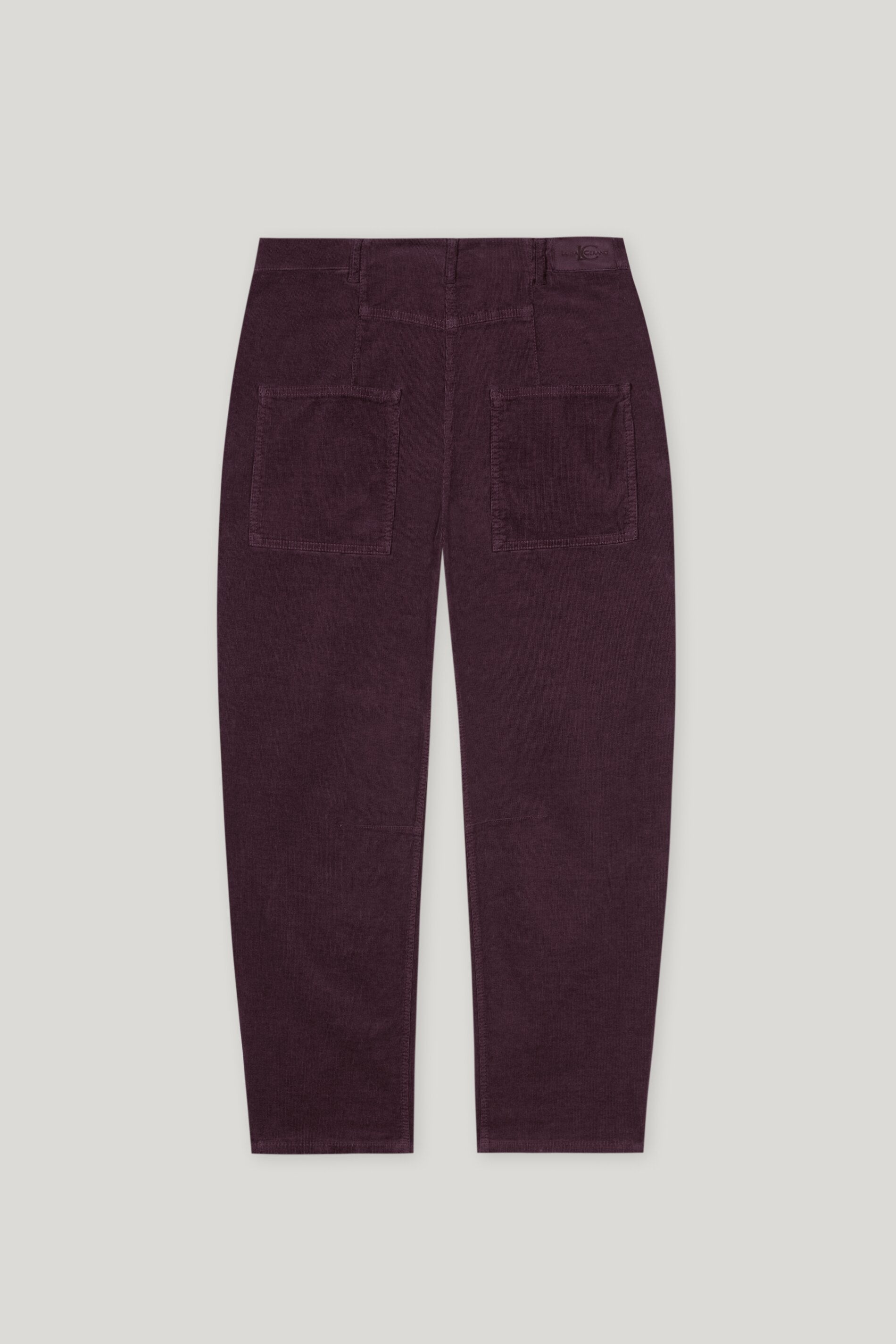 A loose-fitting corduroy style, softly tapered, curved leg with cord texture, front stud detailing, pre-shaped knees, and four-pocket styling.