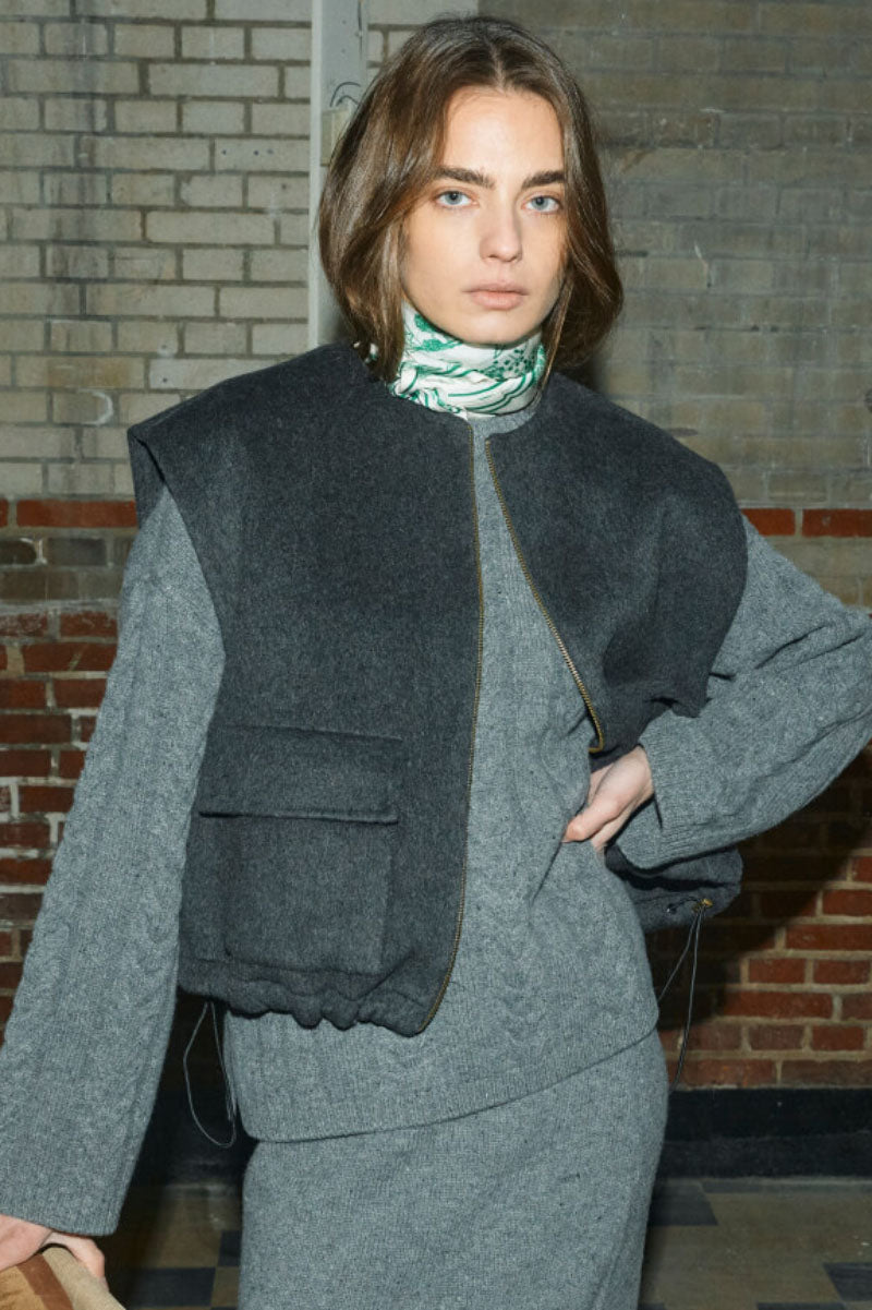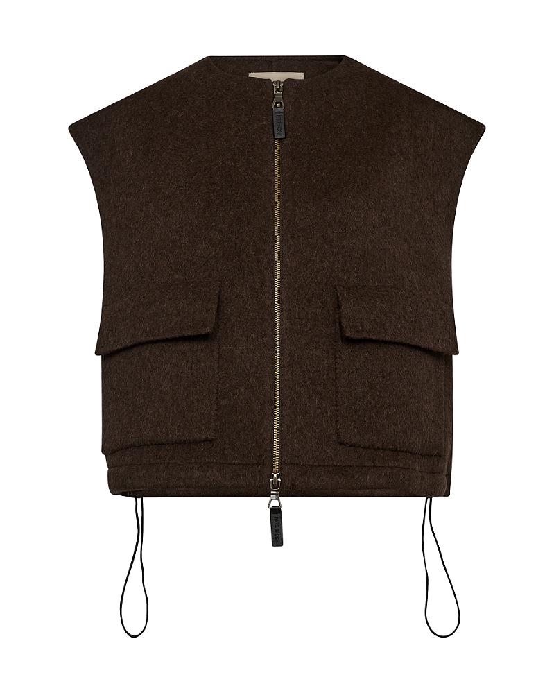 A chic mélange wool vest featuring a full zip closure, adjustable drawstrings at the hem, and practical flap pockets—perfect for stylish layering.