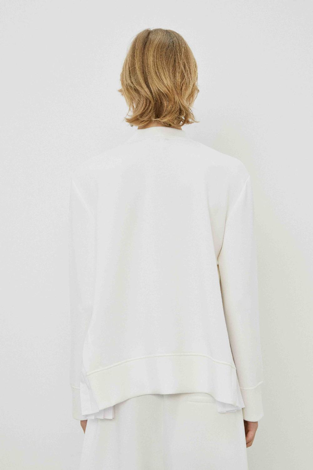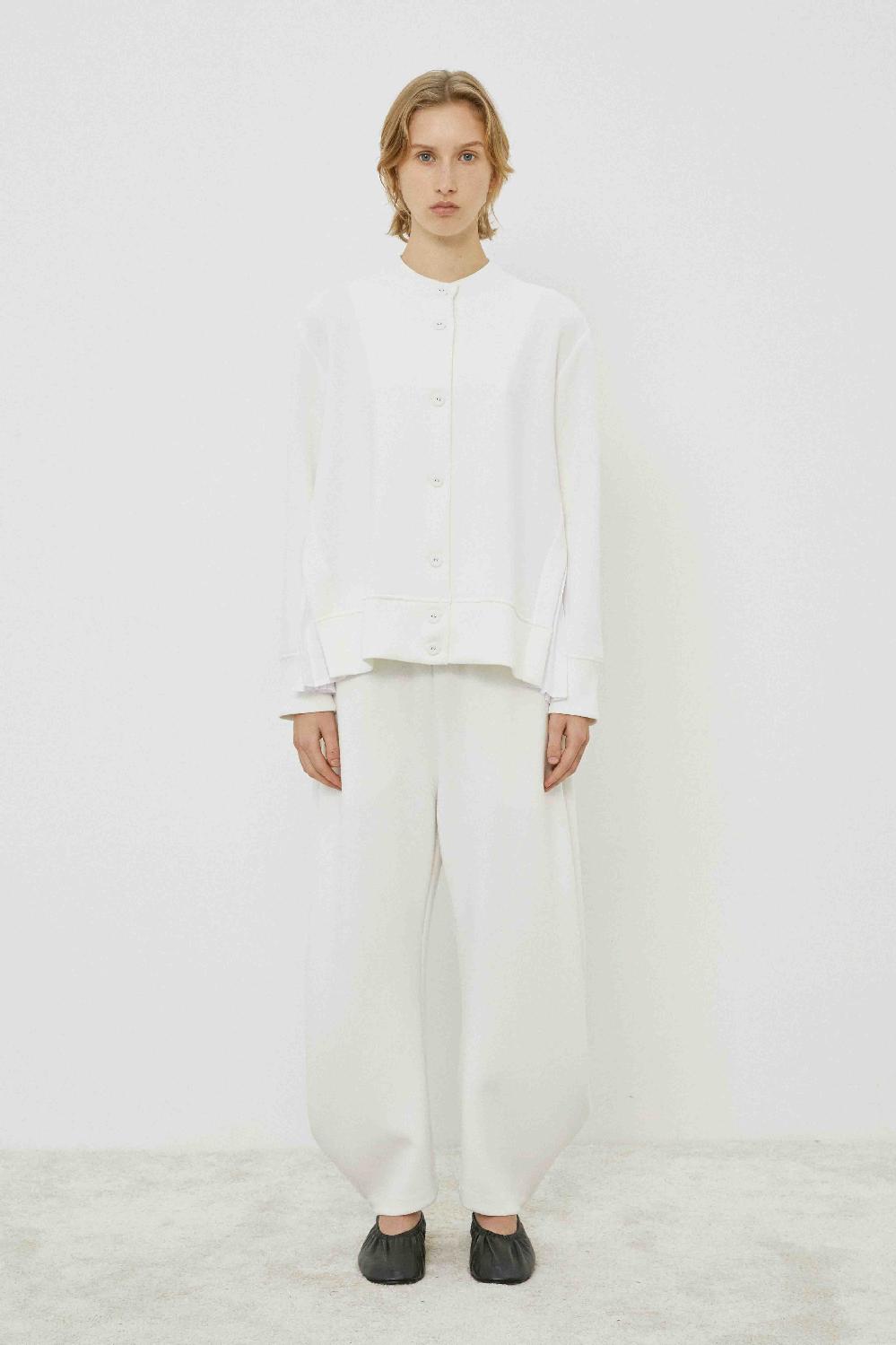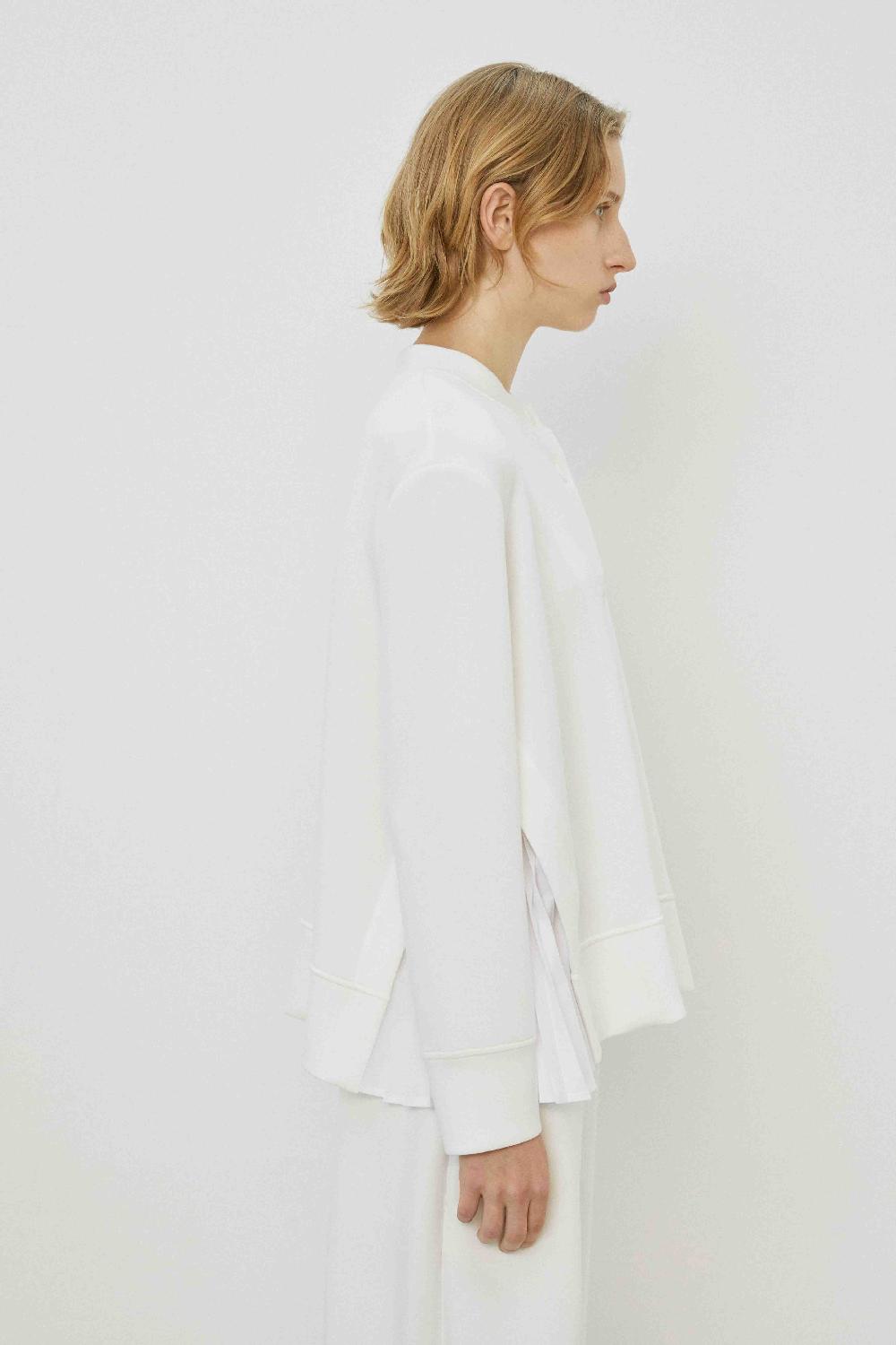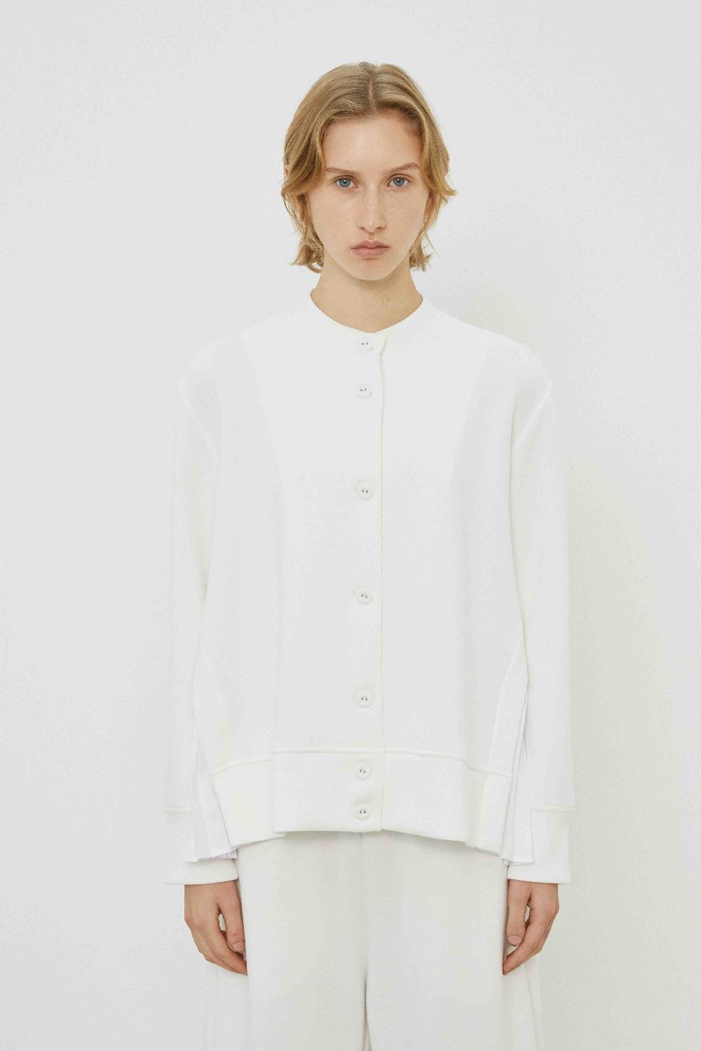 Chic long-sleeved round-collar jacket with pleated side inserts and front button closure — a versatile layer for both casual and elegant looks.