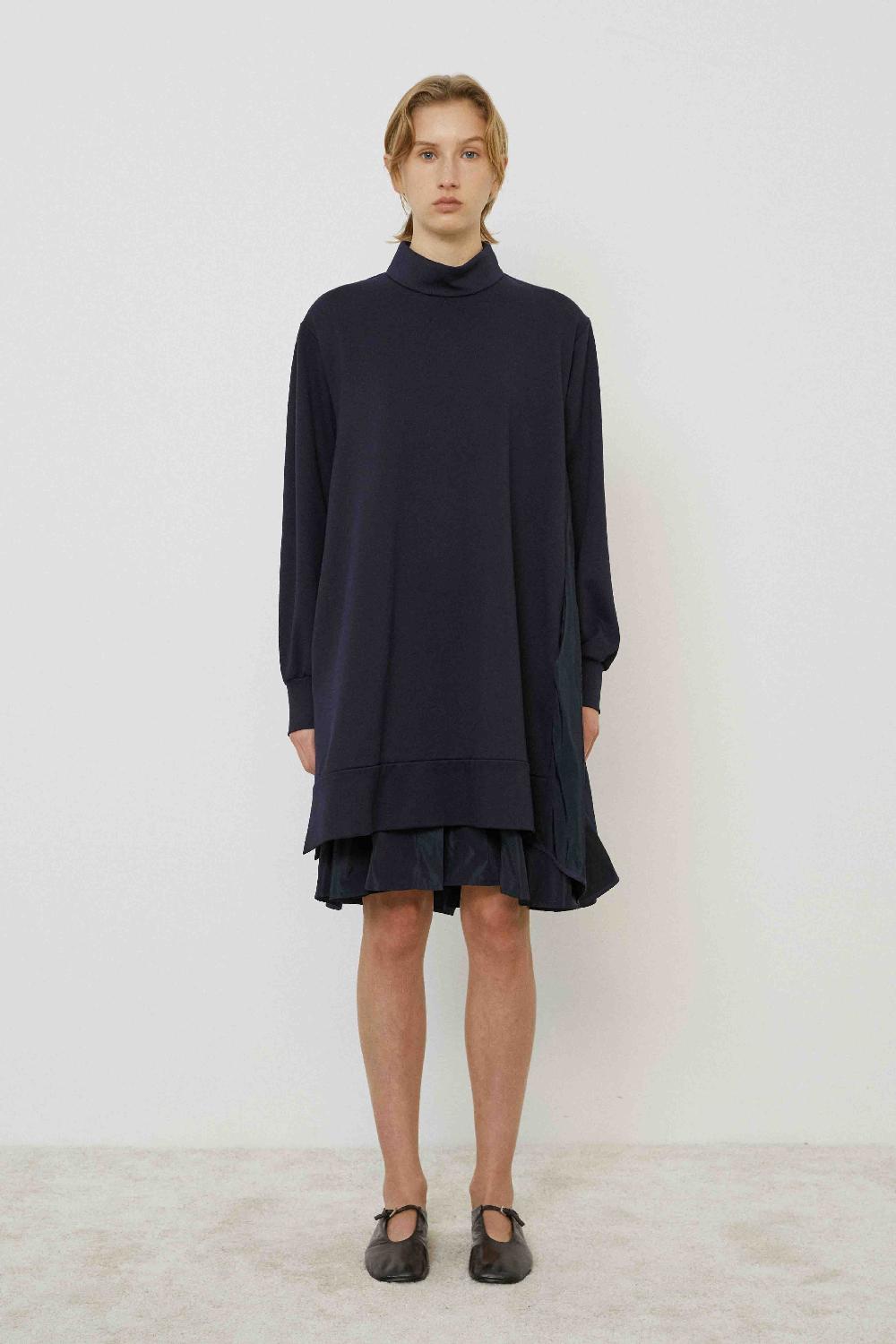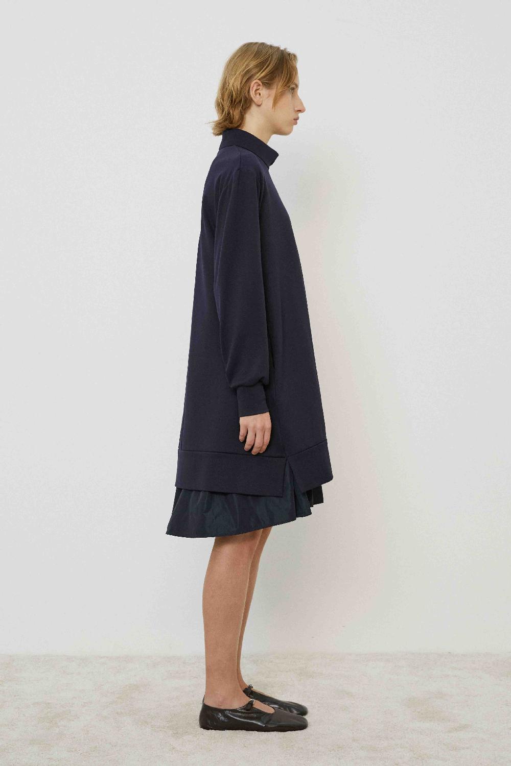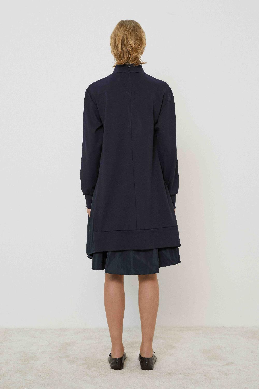 Elegant flared dress with long sleeves, high neckline, side pockets, and taffeta insert, finished with a sleek invisible zip at the back — perfect for refined day-to-night style.