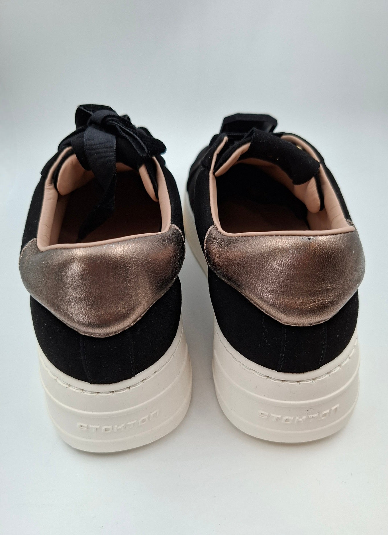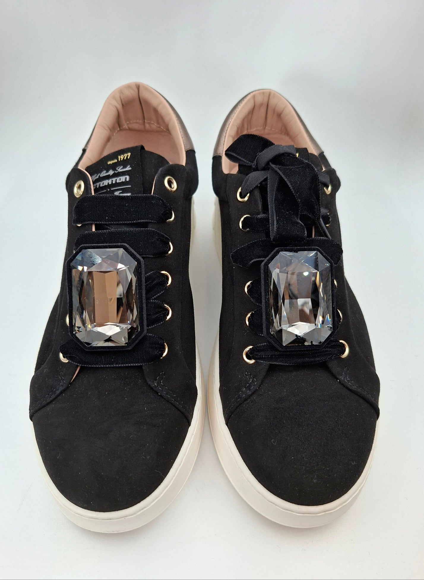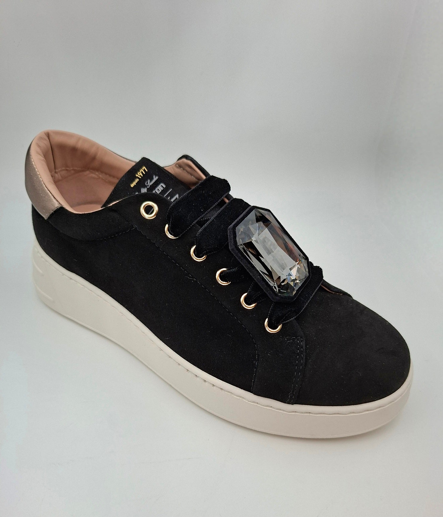This sneaky sneaker features luxurious black suede, decorative gold-tone accents, and a standout jewel adornment attached to the laces. The jewel is detachable and comes with a set of plain laces..