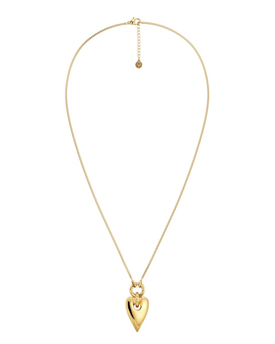 A stylised heart is the centrepiece of the Amore line. An expression of love where the fastener slides through the heart creating a modern look and graceful action. Seen here in a longer necklace in shiny stainless steel. Also available as hoops and a shorter necklace.