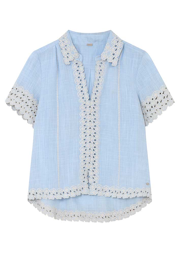 Lilje shirt from Gustav in a fresh sea breeze blue shade combines classic shirt design with Nordic elegance with feminine lace details. The exclusive blend of viscose, polyamide and linen gives the shirt a luxurious texture and a beautiful drape.