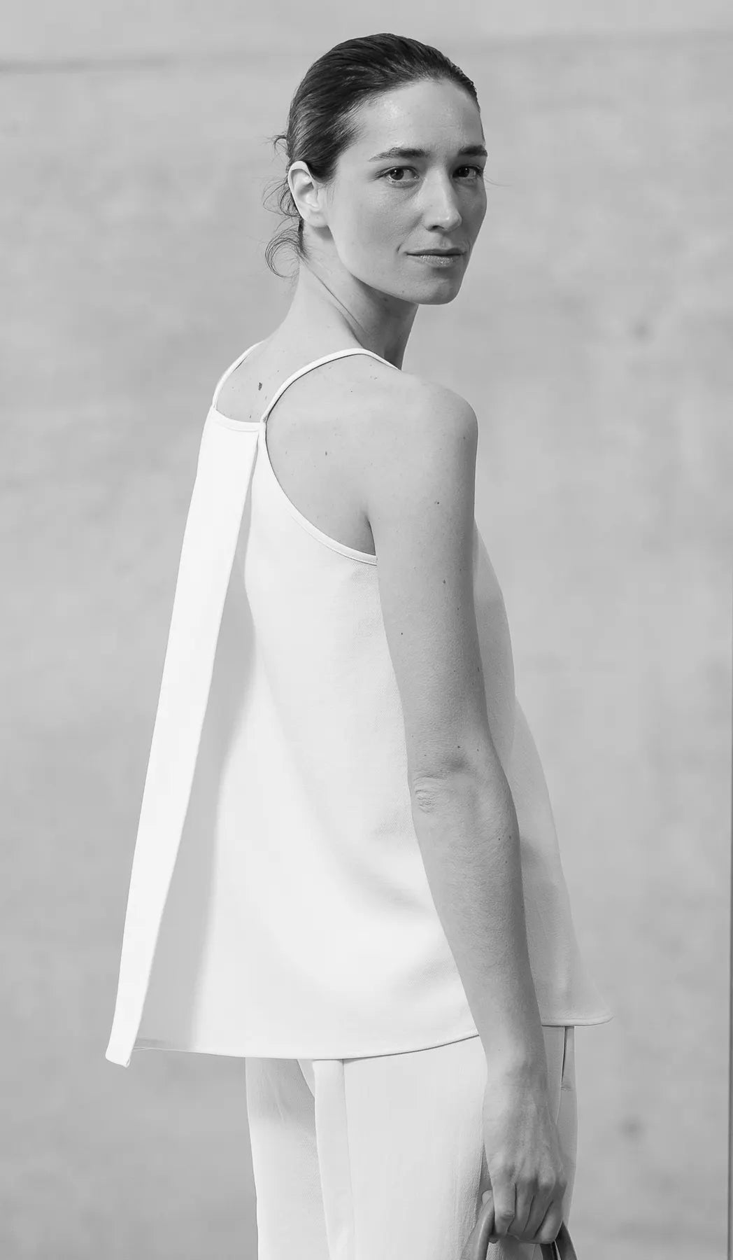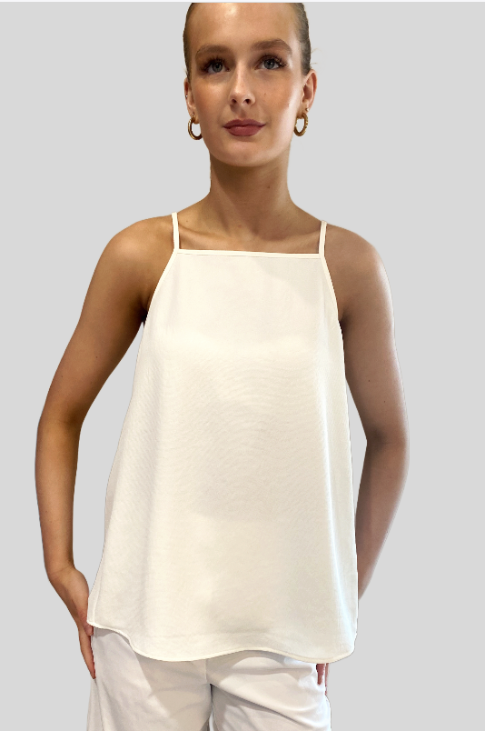 Effortless elegance meets everyday comfort with this Ania Schierholt spaghetti top. The sleeveless A-line silhouette flatters all figures, while delicate spaghetti straps and a subtle back pleat add refined detail. Crafted from fluid fabric that drapes beautifully, this off-white top transitions seamlessly from casual days to evening occasions. Perfect layered or worn alone.