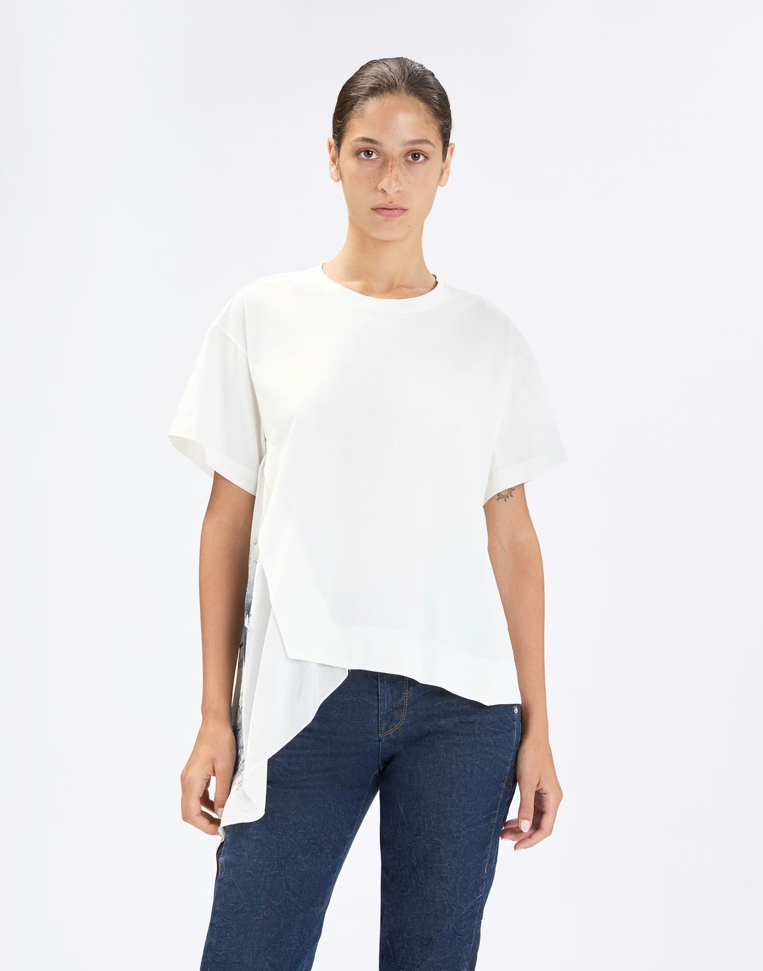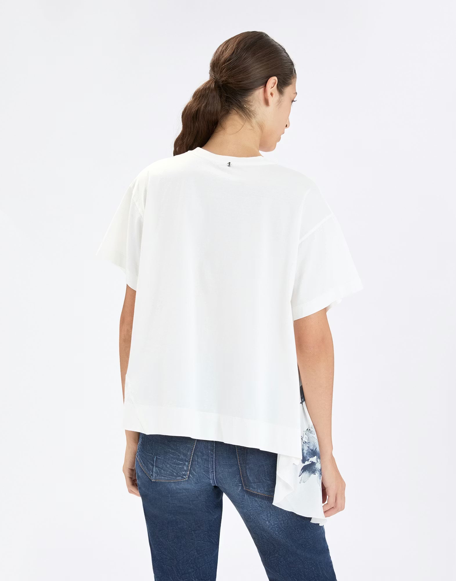 The Regatta T-shirt reinvents the classic white tee with a side insert in lightweight viscose and cupro, cut longer for a flounced effect and printed with a bold blue flower. A soft and feminine update to an everyday essential. Round neckline. Short sleeves. Side insert in viscose and cupro. Exposed stitching. Irregular hem. Swarovski® crystal on the back. Cotton jersey, lightweight, soft handfeel.