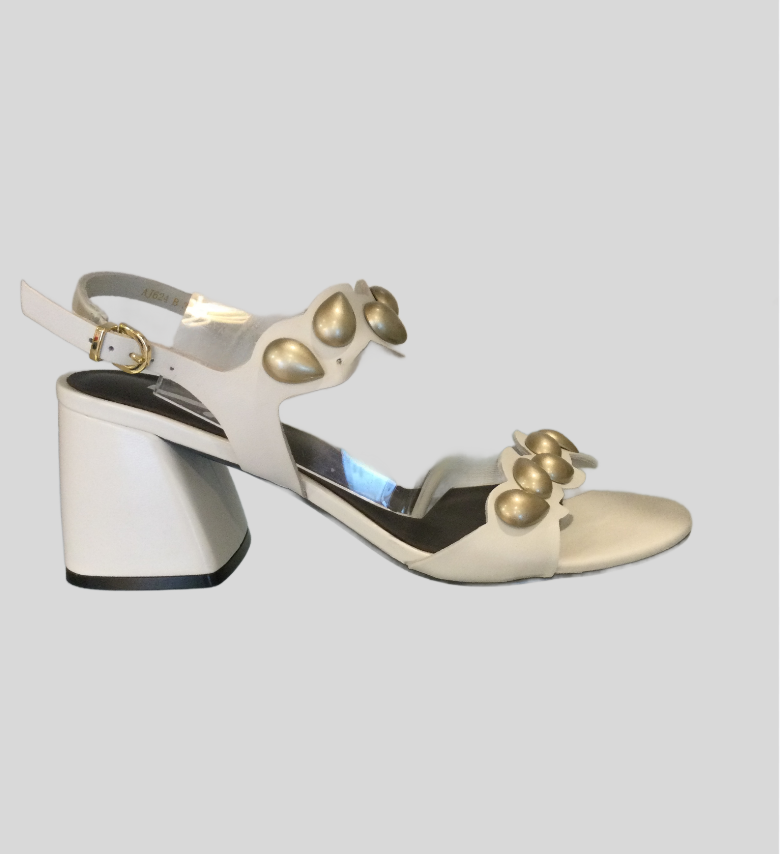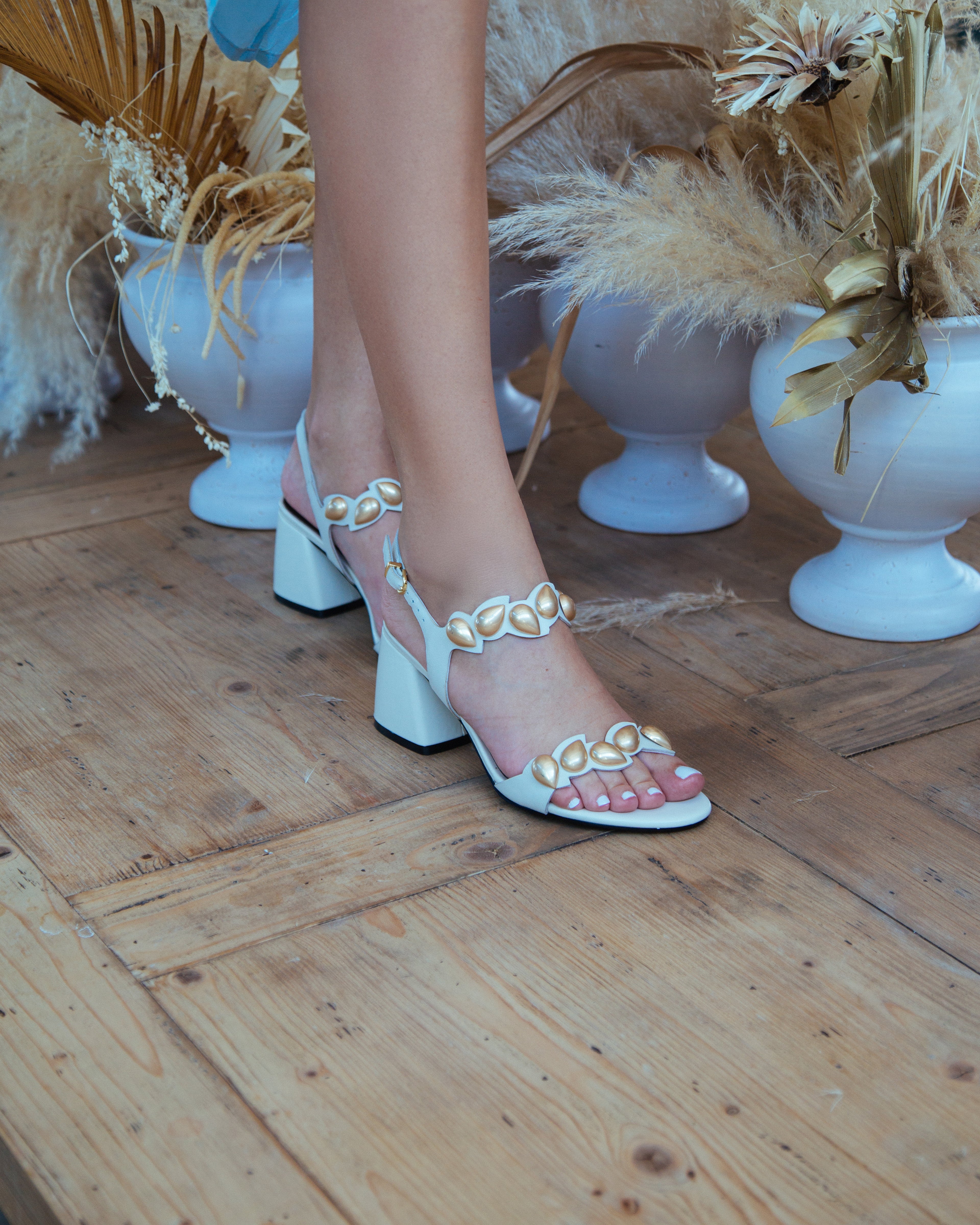 Elegant block heel sandal in soft off-white leather, featuring delicate gold detailing along the straps. The sturdy block heel provides all-day comfort and stability, while the refined metallic accents add a touch of sophistication. Perfect for dressing up casual outfits or pairing with evening wear. A versatile staple that transitions effortlessly from day to night.