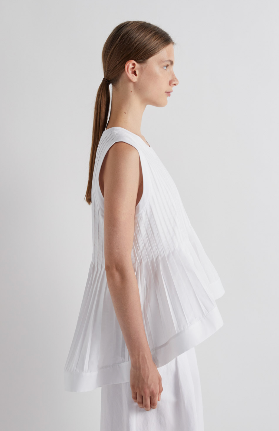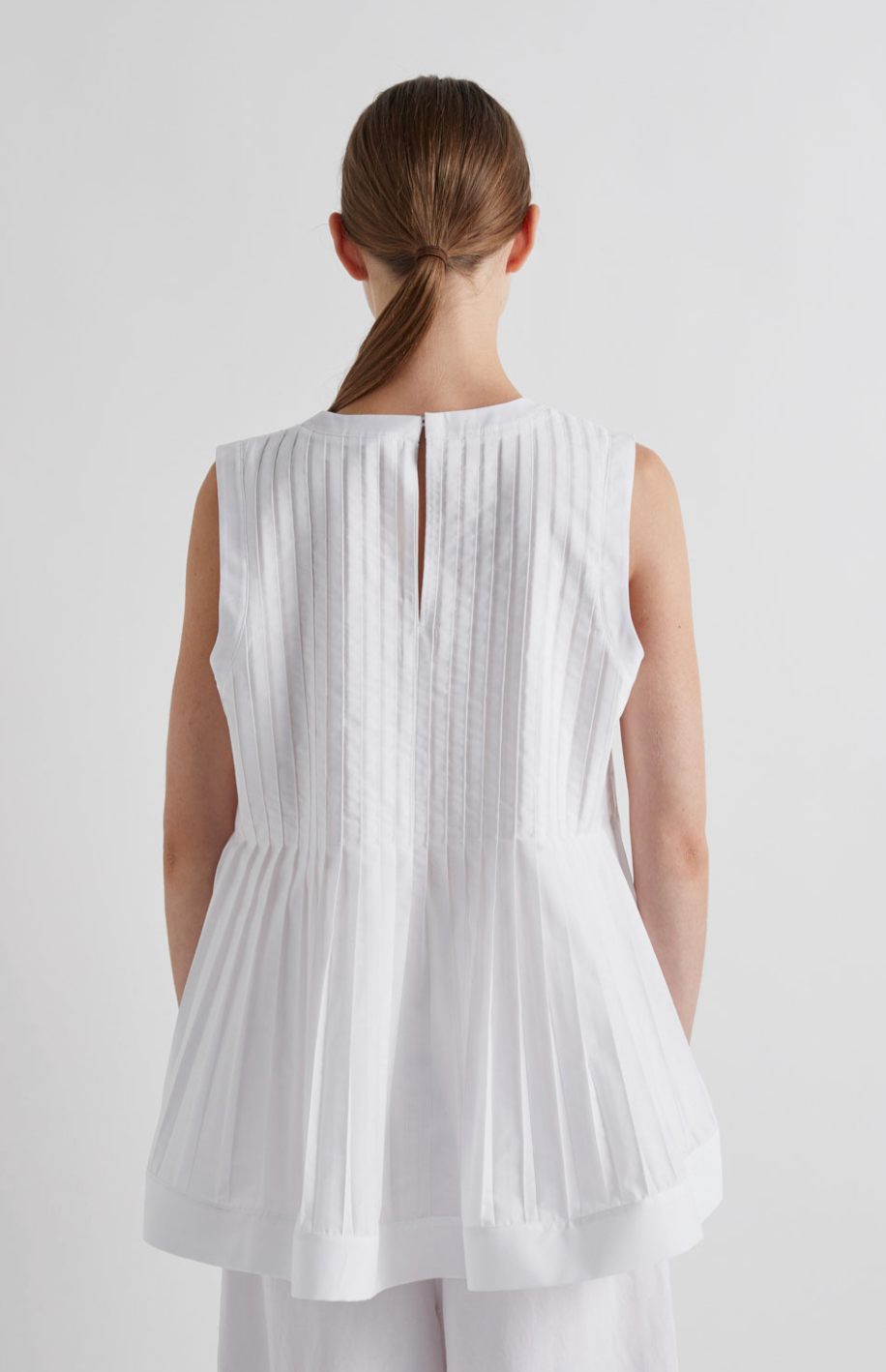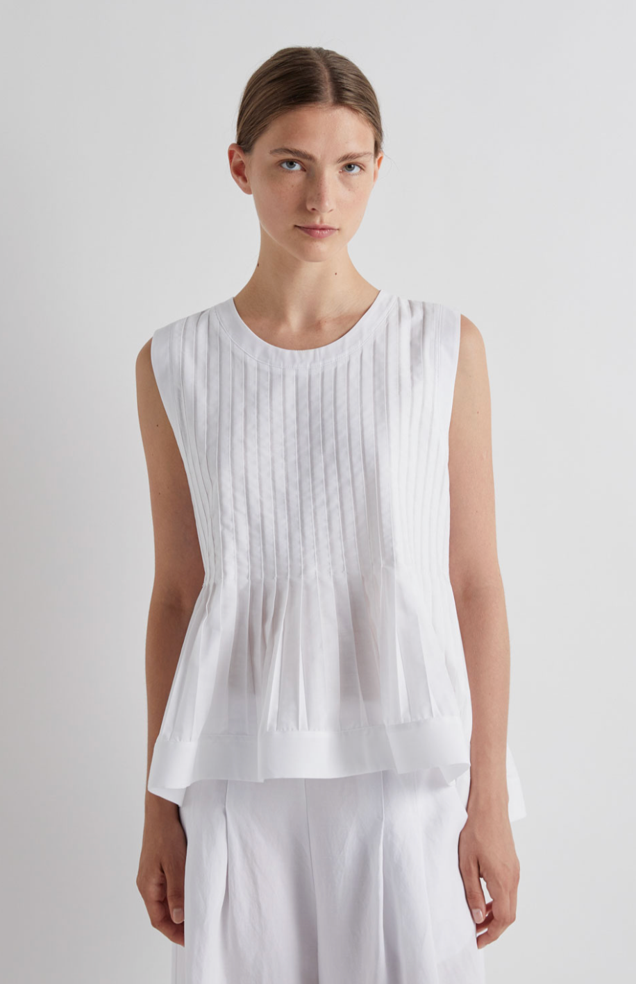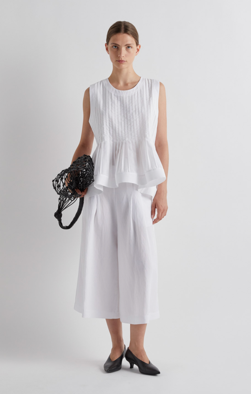 Elevate your wardrobe with this striking white peplum top, featuring delicate pleats and a sleeveless silhouette. The structured peplum hem adds a flattering, feminine touch that cinches at the waist for a polished look. Perfect for dressing up or down, this versatile piece pairs effortlessly with tailored trousers, skirts, or jeans. Ideal for both professional settings and weekend outings, it's a timeless addition to any fashion-forward collection.