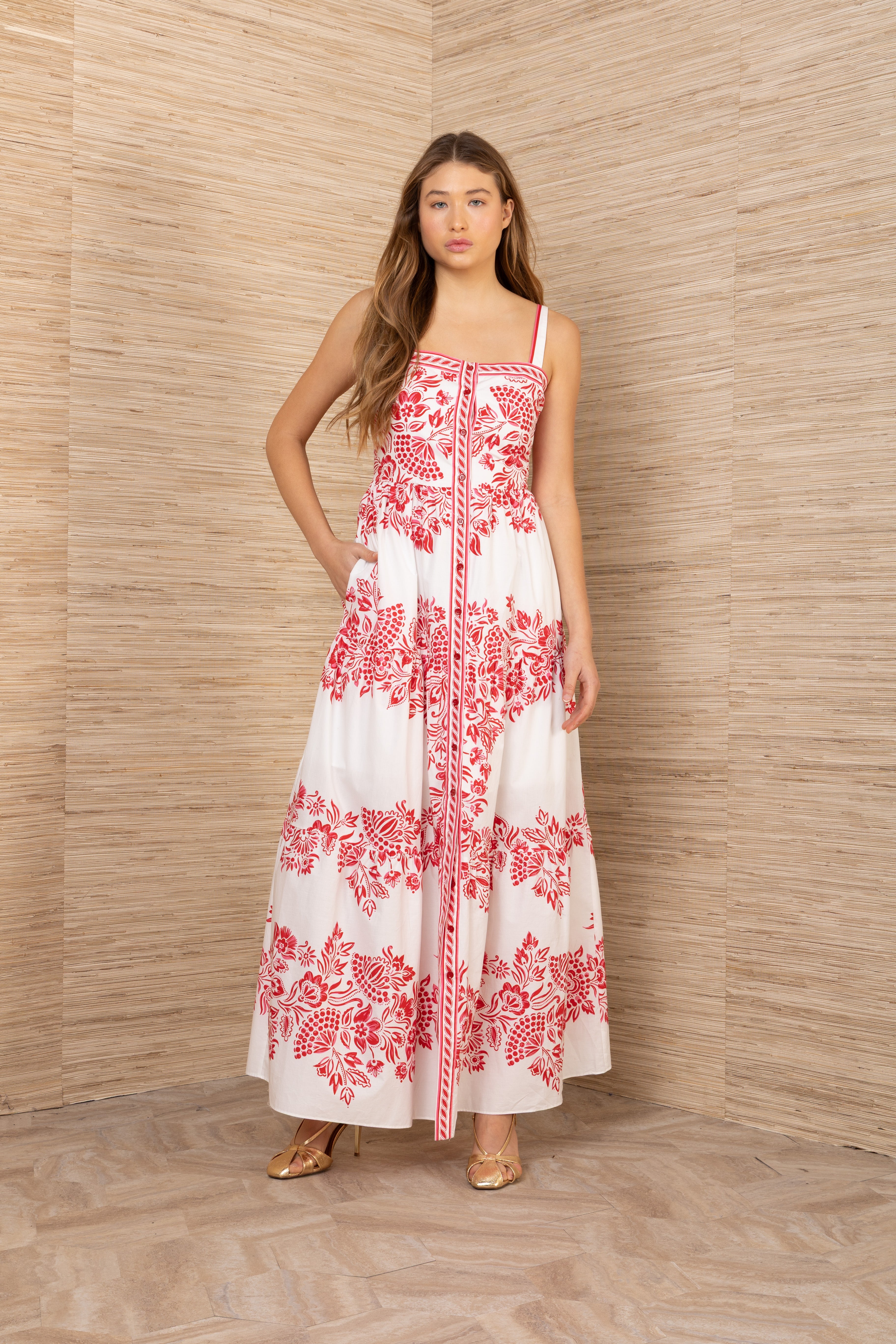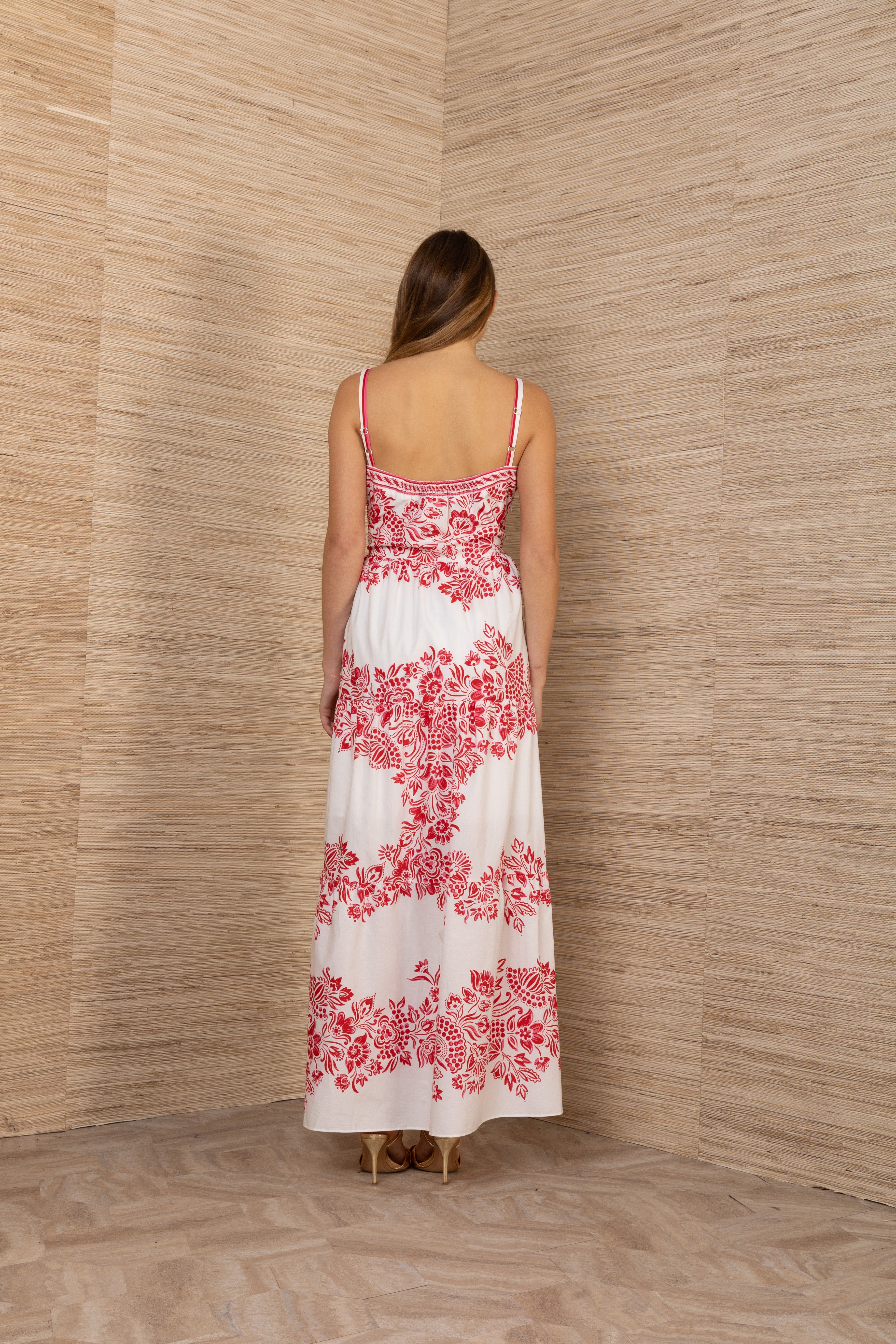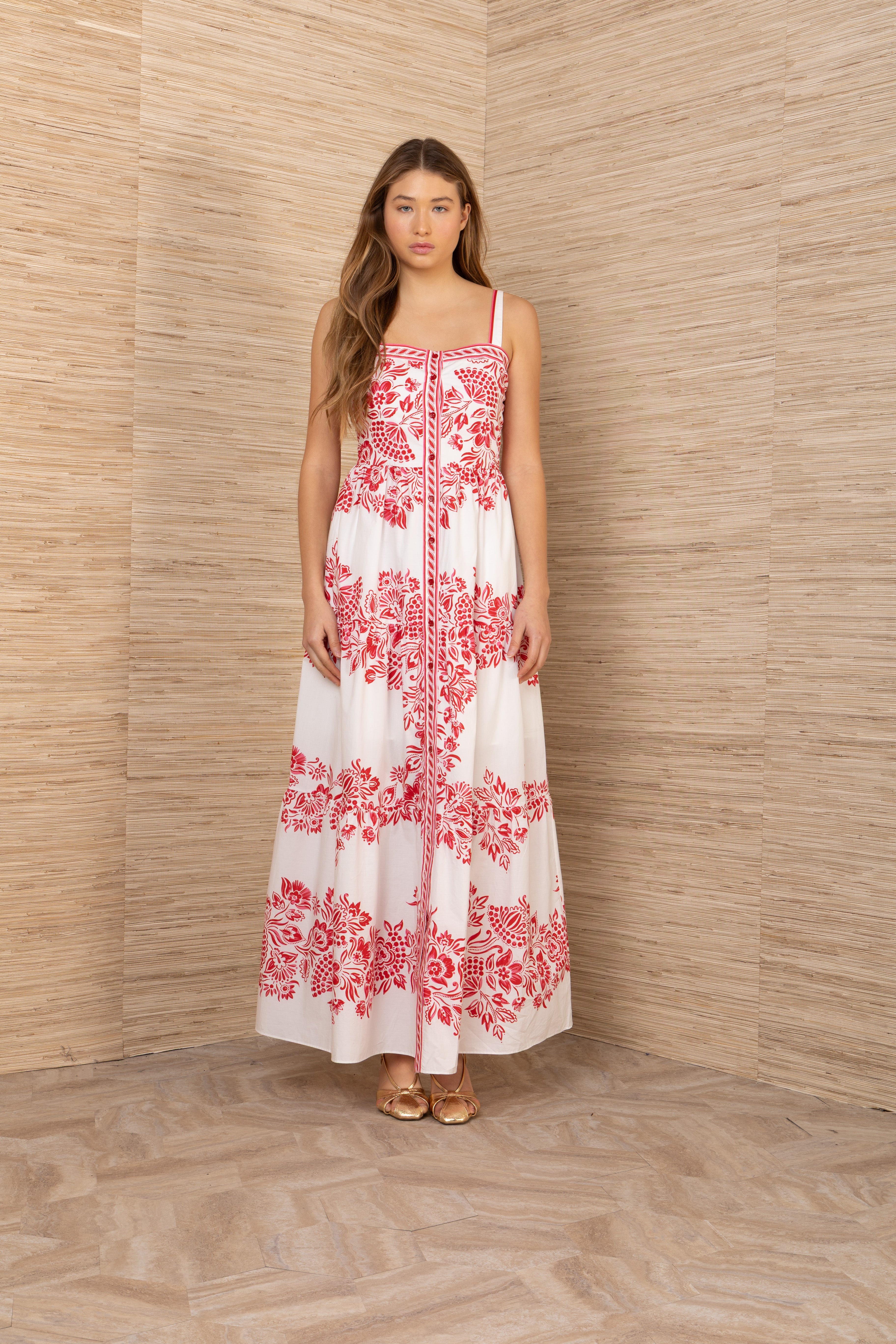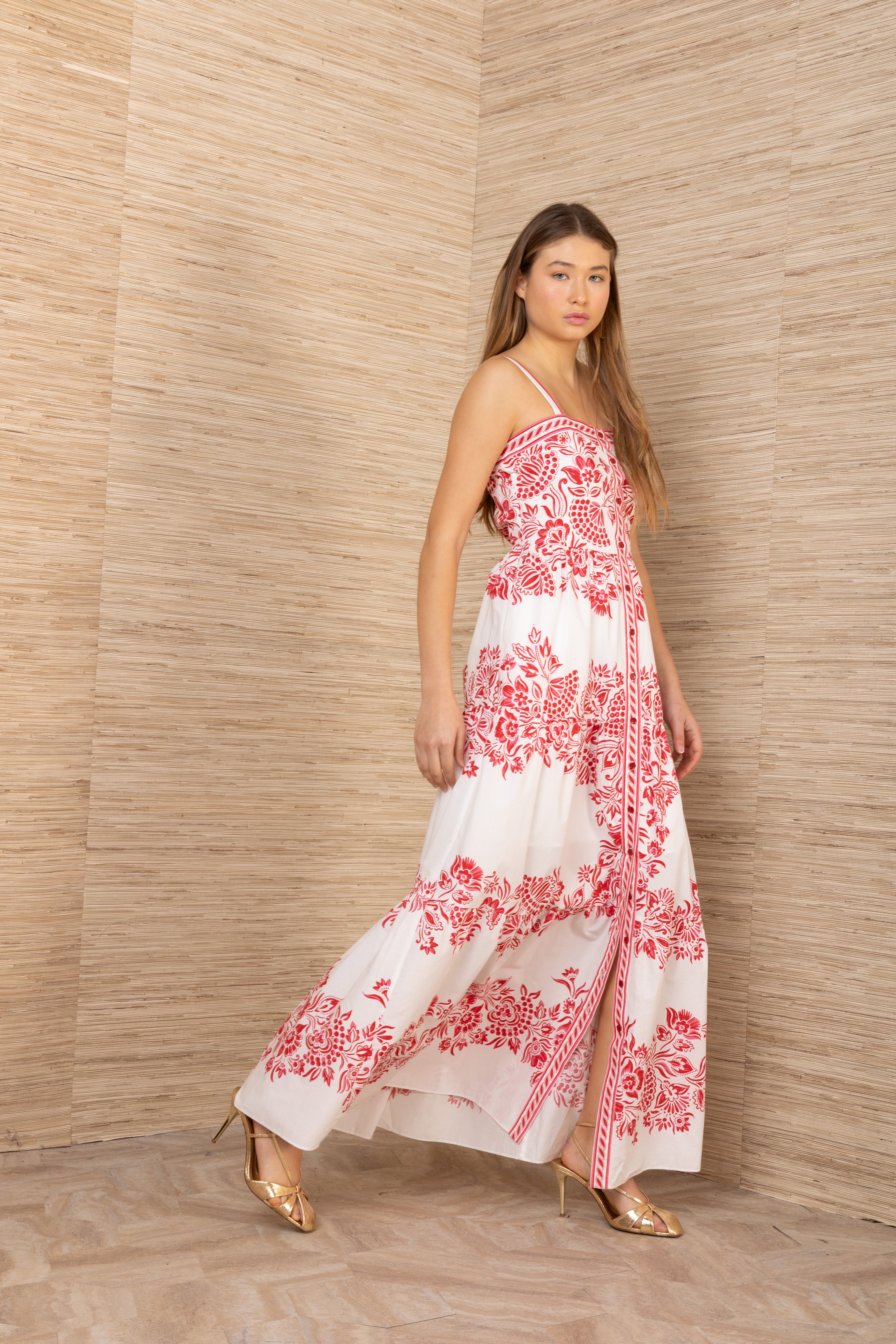 Elegant dress with straps and button placket running the full length. Cape skirt creates a flowing, sophisticated silhouette. Made from 100% cotton for maximum comfort and breathability. Wash on delicate cycle at 30 degrees to preserve quality. Perfect for both everyday wear and special occasions.