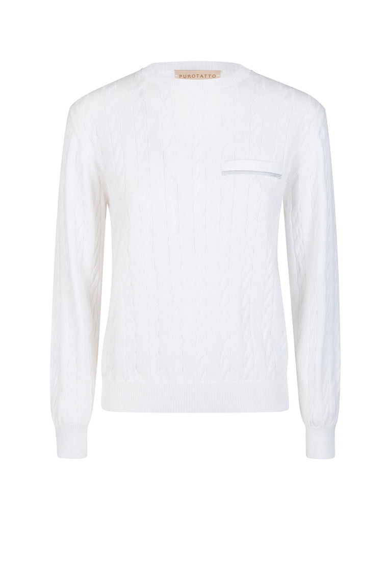 Timeless cable knit sweater featuring a classic round neckline and intricate bead detailing across the front. The structured knit design offers warmth and sophistication, perfect for layering or wearing solo. A versatile wardrobe essential that transitions effortlessly from casual to polished occasions.